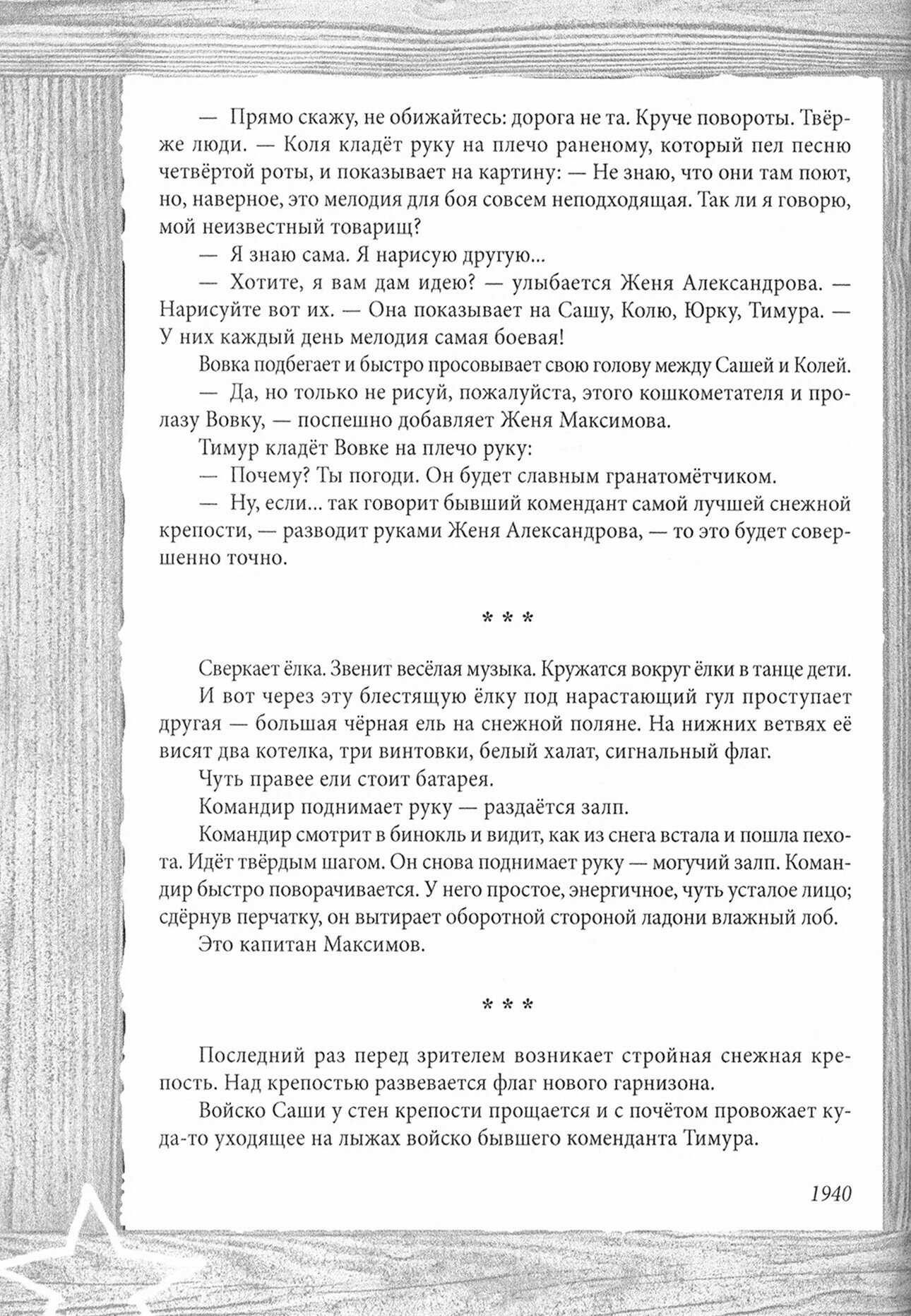 Книги А. Гайдара в представлении не нуждаются, пока живы люди, рождeнные в СССР. Прочитал сыну "Тимур и его команда" и поразился, насколько чeтко и ясно там изложены не только советские идеалы предвоенной поры, но и даже старый кодекс чести дворовых пацанов: не бить слабого и лежачего, перед врагом стоять твeрдо и глядеть дерзко, всегда давать сдачи, противника достойного уважать, не бить беззащитного (это к эпизоду, когда Фигура бьeт Гейку, удерживаемого за руки). Раньше я не обращал внимания на 1940 год написания, теперь же вдруг ощутил прямо-таки растворeнную в воздухе скрытую угрозу и тревогу (погибший на границе отец соседки, отправляющийся бронепоезд, инженер, ставший танкистом и даже персонаж "старика из пьесы", ожидающий нападения). Гайдар предсказал страшный следующий год. Рекомендую читать еe детям, и не только мальчишкам. Оформлена книга старыми фотографиями пионеров, беспризорников, красноармейцев 30-х годов.
