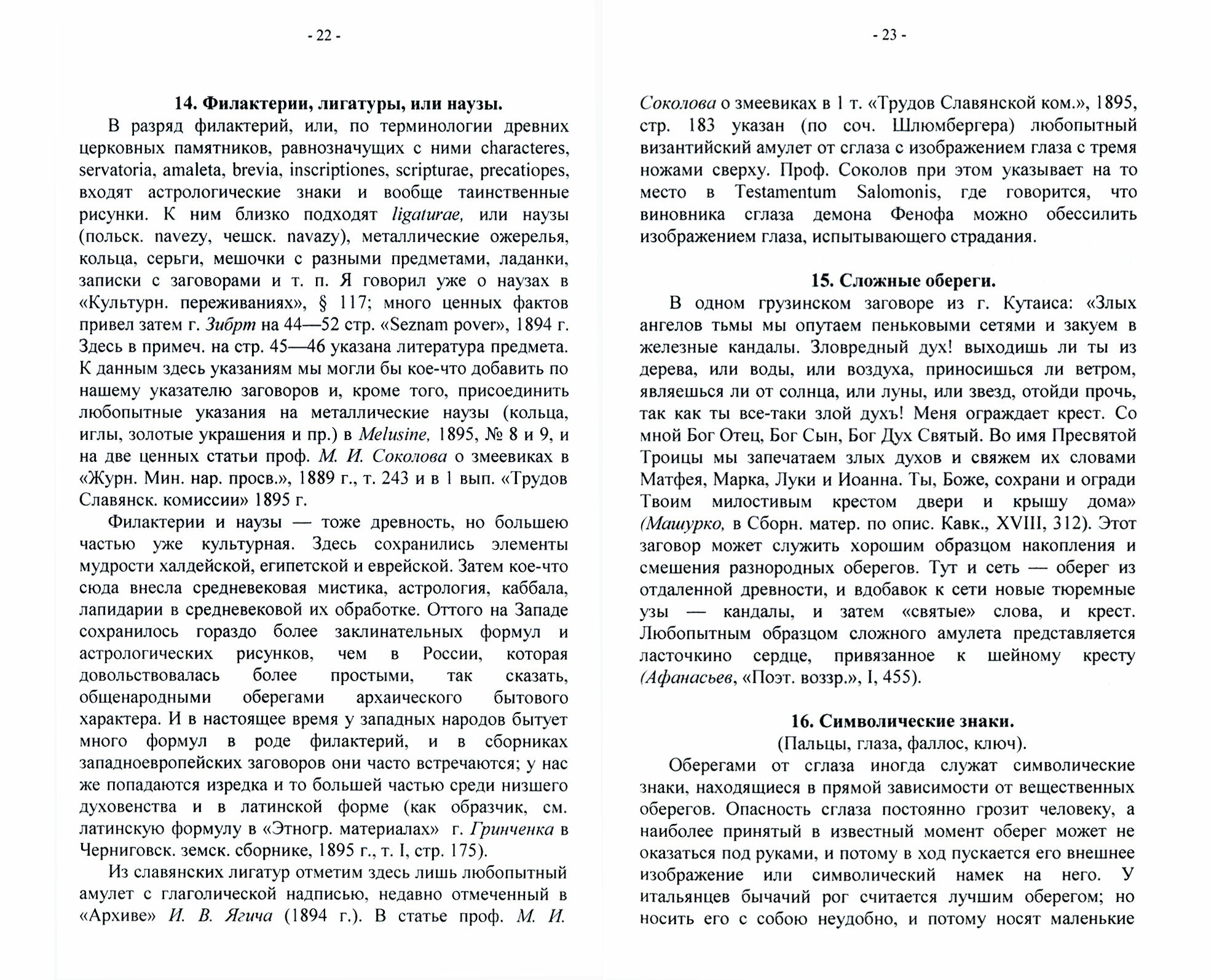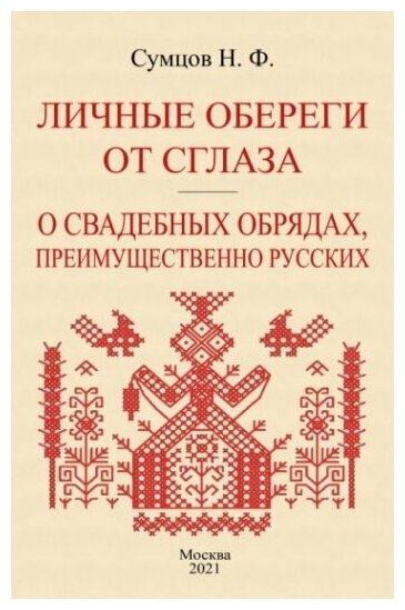 Сумцов Николай Федорович (1854–1922), фольклорист и этнограф. Автор около 300 исследований, научных и публицистических статей и заметок, монографий по истории литературы и искусства. Личные обереги от сглаза (первое издание в 1896 г.). Оглавление: Слизыванье и сплёвыванье; Верёвка от повешенного. Могильная земля; Рога. Камни; Соль; Огонь, угольки и зола; Сеть; Обувь: лапти; Бубенчики и колокольчики; Подкова; Цветные повязки; Детская сорочка; Волчьи зубы и летучие мыши; Деревья. Травы. Веник; Филактерии, лигатуры или наузы; Сложные обереги; Символические знаки (пальцы, глаза, фаллос, ключ); Передача сглаза. Вторая книга: О свадебных обрядах, преимущественно русских (первое издание в 1881 г.) В книге все подробности свадебного ритуала. Помимо изучения русских свадебных обрядов, затронуты свадебные обряды западных и южных славян, а также древних индусов, греков, римлян и германцев. Тираж 30 экз. выполнен по технологии print-on-demand.