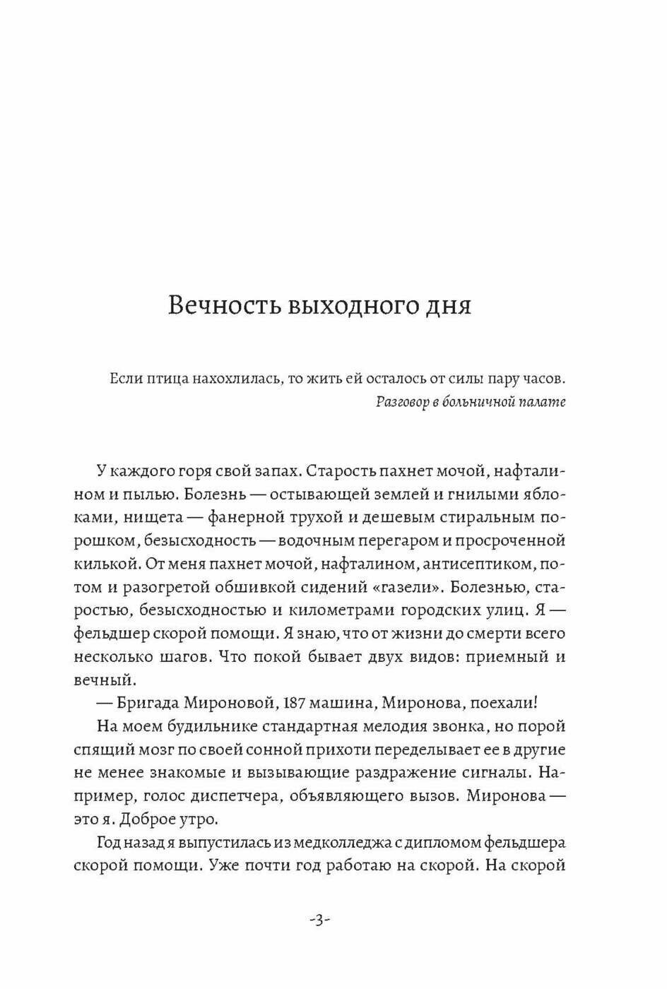 Я начала читать эту книгу с воодушевлением – читать о работе врача всегда интересно. Вроде бы это не какая-то экзотическая редкая специальность, однако же в повседневной жизни мы не задумываемся о том, как живут люди, от чьей работы зависят наше здоровье, а нередко и жизнь. А тут еще и молодой автор, которая написала о своем опыте работы на скорой! То есть все шло к тому, что я должна была получить удовольствие от прочтения книги, – интересная тема и автобиографическая проза (для меня это практически всегда плюс). Однако меня постигло разочарование. Перед нами не законченное произведение, а просто практически необработанные материалы, заметки автора. В книге нет сюжета, нет концепции. Просто случаи из практики. Чаще всего печальные, но иногда и забавные. Что ни говорите, но это не литература. Хотя при желании это превратить в литературу можно. Причем сделать это можно разными способами. Первый способ – ввести линию рассказчицы. Потому что в книге, которая написана на основе жизненного опыта автора, мы, как это ни парадоксально, автора вообще не видим! То есть книга написана от первого лица, но мы не узнаем о рассказчице ничего. Кто она, откуда, как стала фельдшером, какая у нее семья, кто ее друзья, как она оказалась в общежитии, какие у нее планы на жизнь – одни вопросы и никаких ответов. Это грандиозное упущение, на мой взгляд. Личность рассказчика – это беспроигрышный способ создать сюжет, объединить разные сюжетные линии и т.п. Если бы автор пошла этим путем, то ей пришлось бы капитально переписать книгу. Но это бы определенно пошло тексту на пользу. Конечно, я могу понять, что не всякому автору хочется излагать подробности своей биографии на публику. В таком случае есть второй способ – полностью самоустраниться и написать книгу от третьего лица. Во многом это даже сложнее, потому что при таком подходе необходимо тщательно продумать все сюжетные линии, образы всех персонажей. Должна быть какая-то концепция. Должно быть что-то, что автор хочет рассказать. Увы, в книге этого нет. С сожалением констатирую, что, несмотря на то, что книга издана, перед нами черновики и наброски, а не готовая книга состоявшегося автора.