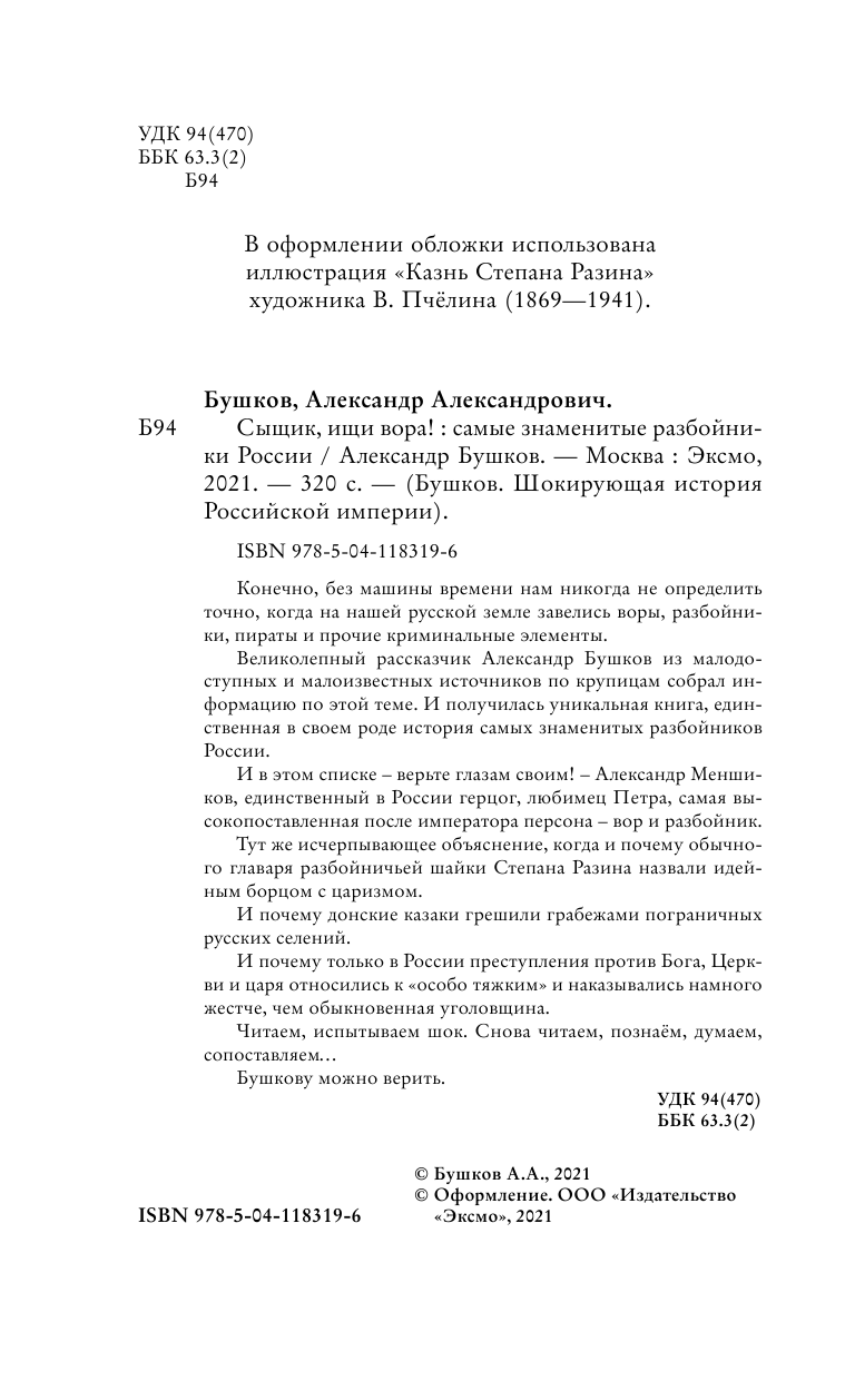 Сервис сравнения цен СкидкаГИД предлагает сравнить цены на товар «Книга: Сыщик ищи вора! Или самые знаменитые разбойники России (Александр Бушков); Эксмо, Редакция 1, 2021»