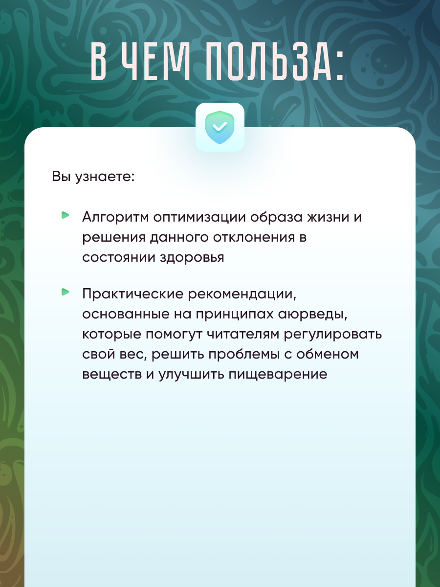 В последние десятилетия увеличивается количество людей, страдающих избыточной массой тела и ожирением. Это грозит развитием различных осложнений и снижением качества жизни. Многочисленные предложения разных диет и других подходов, наводнившие интернет и популярные журналы, не решают проблему. Аюрведа предлагает алгоритм оптимизации образа жизни и решения данного отклонения в состоянии здоровья. Этот подход основан как на информации из аюрведических источников, так и на исследованиях аюрведических методов и средств с помощью современной доказательной медицины. Простые и доступные правила и принципы позволяют легко и непринужденно убрать лишние килограммы.