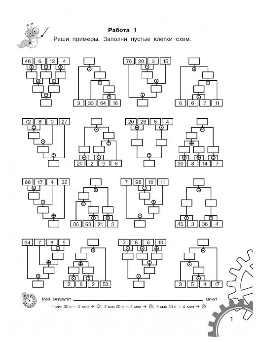 В конце каждой страницы предусмотрено место для записи времени, в течение которого ребёнок выполнил вычисления, а также указано время для оценки этого результата.