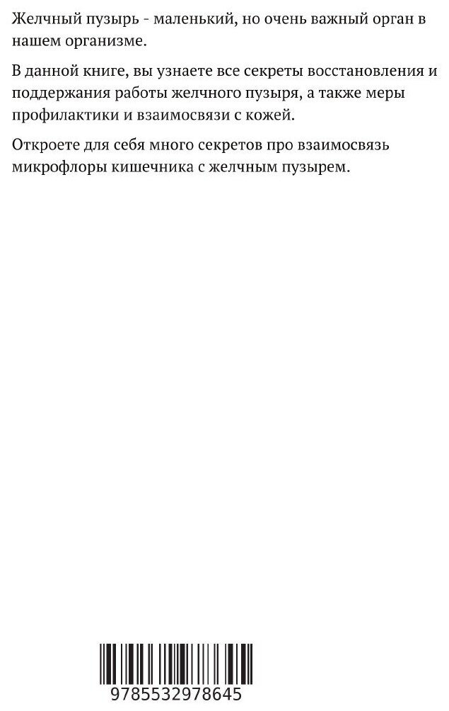 Желчный пузырь – маленький, но очень важный орган в нашем организме. В данной книге, вы узнаете все секреты восстановления и поддержания работы желчного пузыря, а также меры профилактики и взаимосвязи с кожей. Откроете для себя много секретов про взаимосвязь микрофлоры кишечника с желчным пузырем.