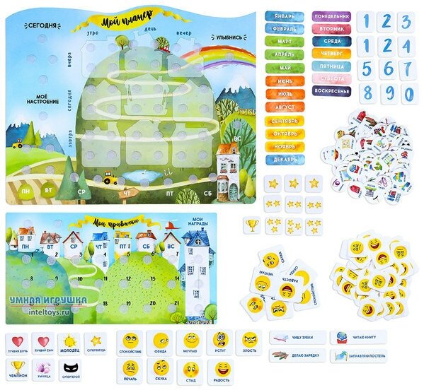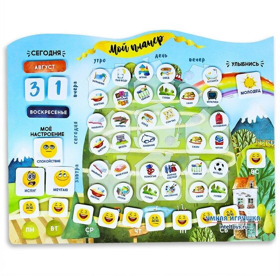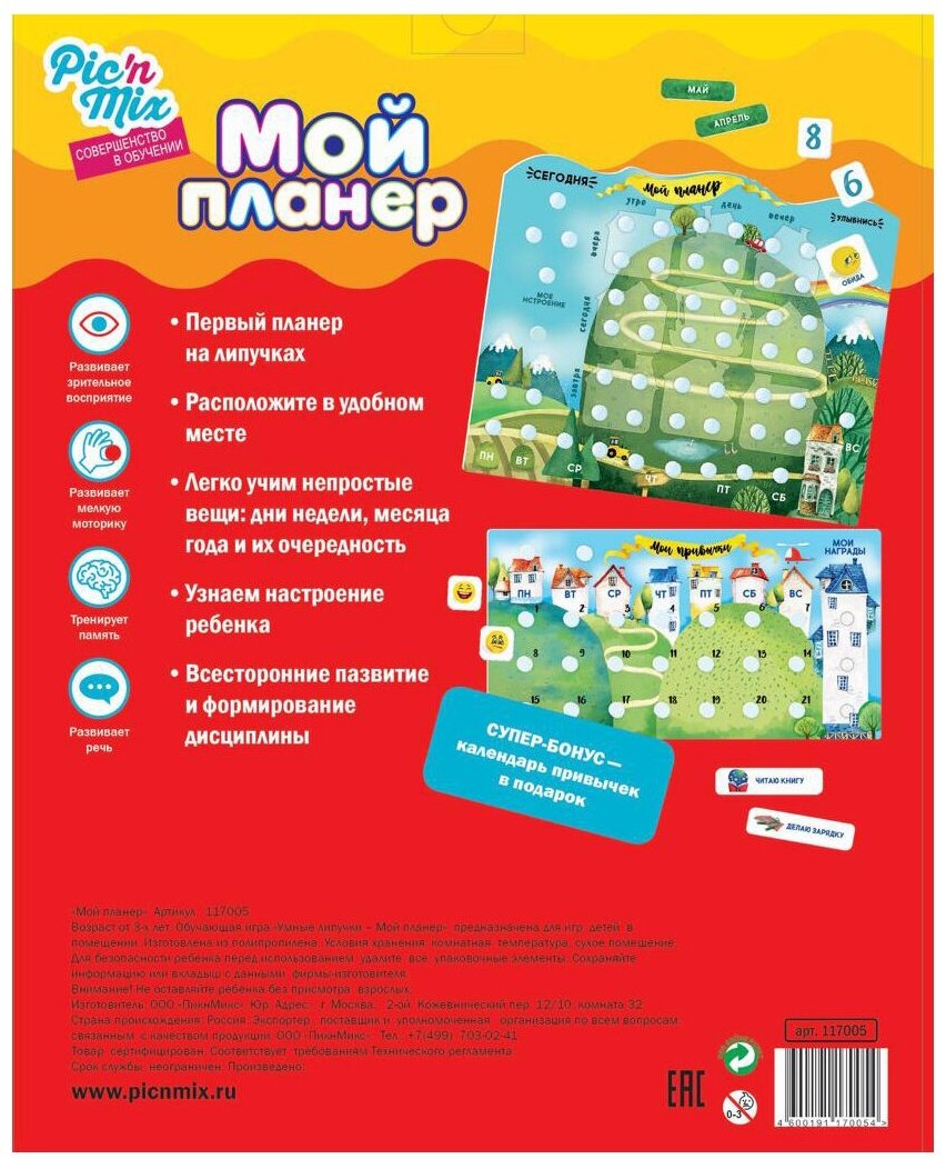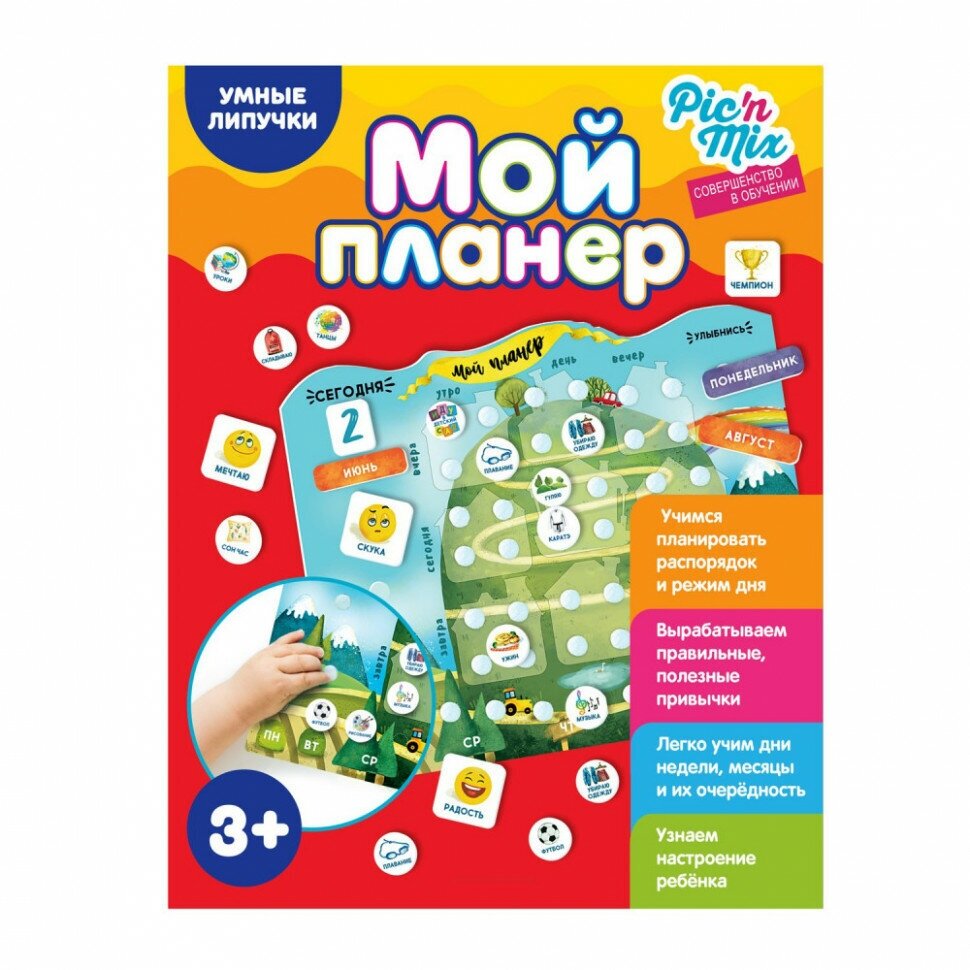 Игра Мой планер становится незаменимым помощником в семье. У ребенка столько своих маленьких дел: необходимо навестить бабушку, позаниматься рисованием, сходить на прогулку и, конечно же, уделить время забавам. Как все успеть? Познакомьте карапуза с расписанием и приучите все делать вовремя с помощью познавательного набора!В комплекте:2 поля;липучки;цифры, дни недели, эмоции и другие жетоны;инструкция.Спутник на каждый деньВаш малыш растет, взрослеет. Помогите ему правильно и продуктивно организовать свою деятельность с помощью планера!Вместе с непоседой заполните игровое поле. Определите, какое сегодня число, месяц, день недели. Если ребенок еще не знаком с этими понятия, то пришло время с ними подружиться!В основном блоке распределите занятия в течение суток. Например, утром необходимо позавтракать, сходить в садик, а вечером посетить кружок. Заметьте, что расписание вы составляете на 3 ближайших дня. Благодаря этому у сорванца формируется представление о временных рамках, а также он учится планировать свои дела.Пусть карапуз отмечает свое настроение забавными смайликами. Почему сегодня на планшете грустная мордашка? А какое обстоятельство вызвало восторг у малыша? Наблюдайте за эмоциями ребенка и становитесь к нему еще ближе!Не забывайте радовать затейника. Каждый день размещайте в зоне «Улыбнись» приятные стикеры. Сегодня ваш кроха съел весь суп? Какой он умница!Формируйте положительные привычки с помощью второго планшета. Например, пусть малыш каждый день чистит зубы и заправляет кровать. За это он получает бонусы и стремится собрать коллекцию поощрительных сюрпризов!В чем пользаС набором ребенок тренирует самодисциплину, внимание, память. Он знакомится с месяцами, числами, новыми терминами. Работая с мелкими элементами, непоседа развивает моторику пальчиков, координацию движений, ловкость рук.Учитесь планировать свой день, чтобы дела выполнялись легко и приносили удовольствие!Параметры товара:мой планер 350х280 мм,мои привычки 295х155 мм,жетоны от 25х25 мм до 80х20 мм,диаметр липучек 10 мм,упаковка – картонная коробка 380х300х15 ммРекомендованный возраст: от 3 лет