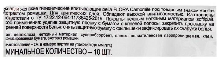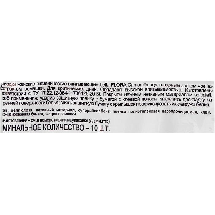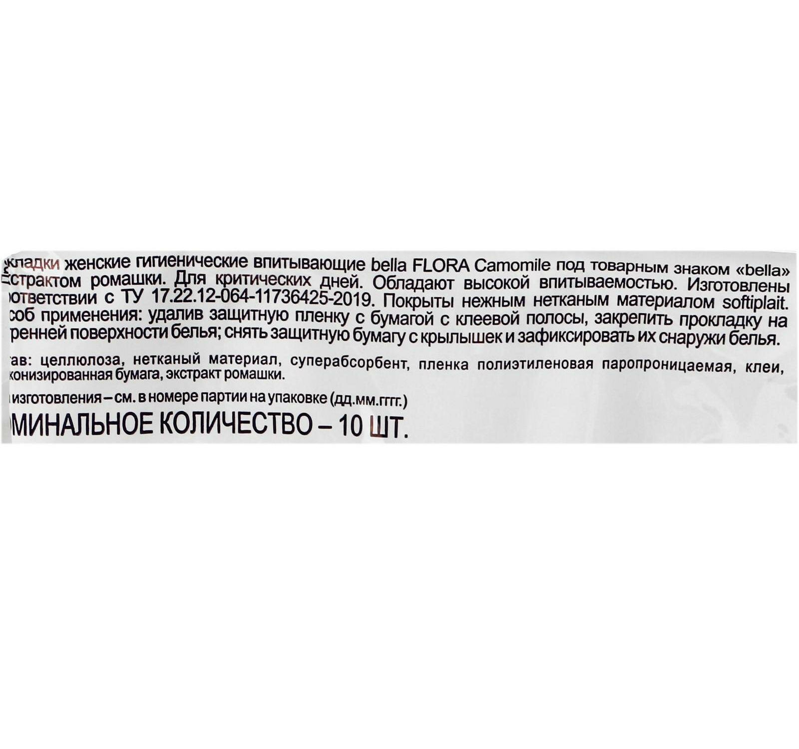 | Полное наименование | Гигиенические прокладки Bella Flora с экстрактом ромашки 4 капли 10 шт |