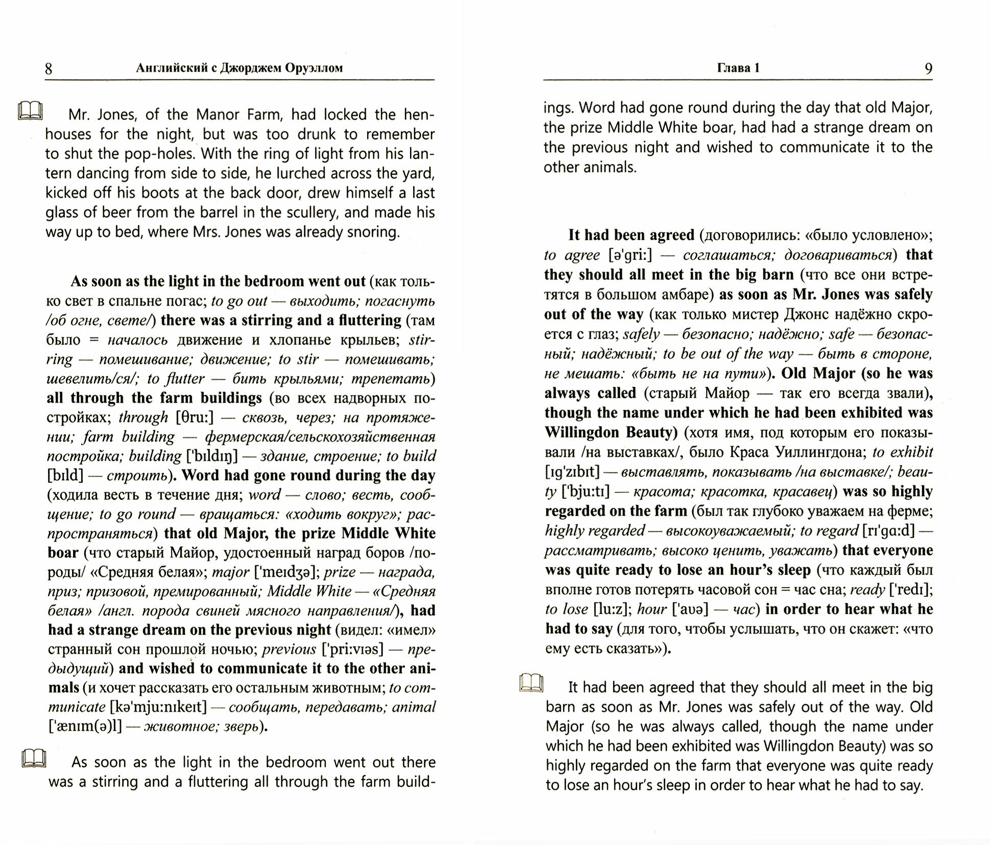 Обитатели фермы крайне недовольны! Хозяин все чаще предпочитает работе бутылку, дела идут хуже некуда. Единственный выход — взять власть в свои руки и установить новые, разумные и справедливые законы! Смешная и страшная в своей достоверности притча о том, как самые лучшие и благородные идеи постепенно превращаются в свою противоположность, обречена еще очень долго оставаться актуальной. Потому что вновь и вновь в разных уголках Земли после всех невзгод, испытаний и жертв оказывается, что ВСЕ ЖИВОТНЫЕ РАВНЫ, НО НЕКОТОРЫЕ — РАВНЕЕ ДРУГИХ! Повесть адаптирована по методу обучающего чтения Ильи Франка. Уникальность метода заключается в том, что запоминание слов и выражений происходит за счет их повторяемости, без заучивания и необходимости использовать словарь.