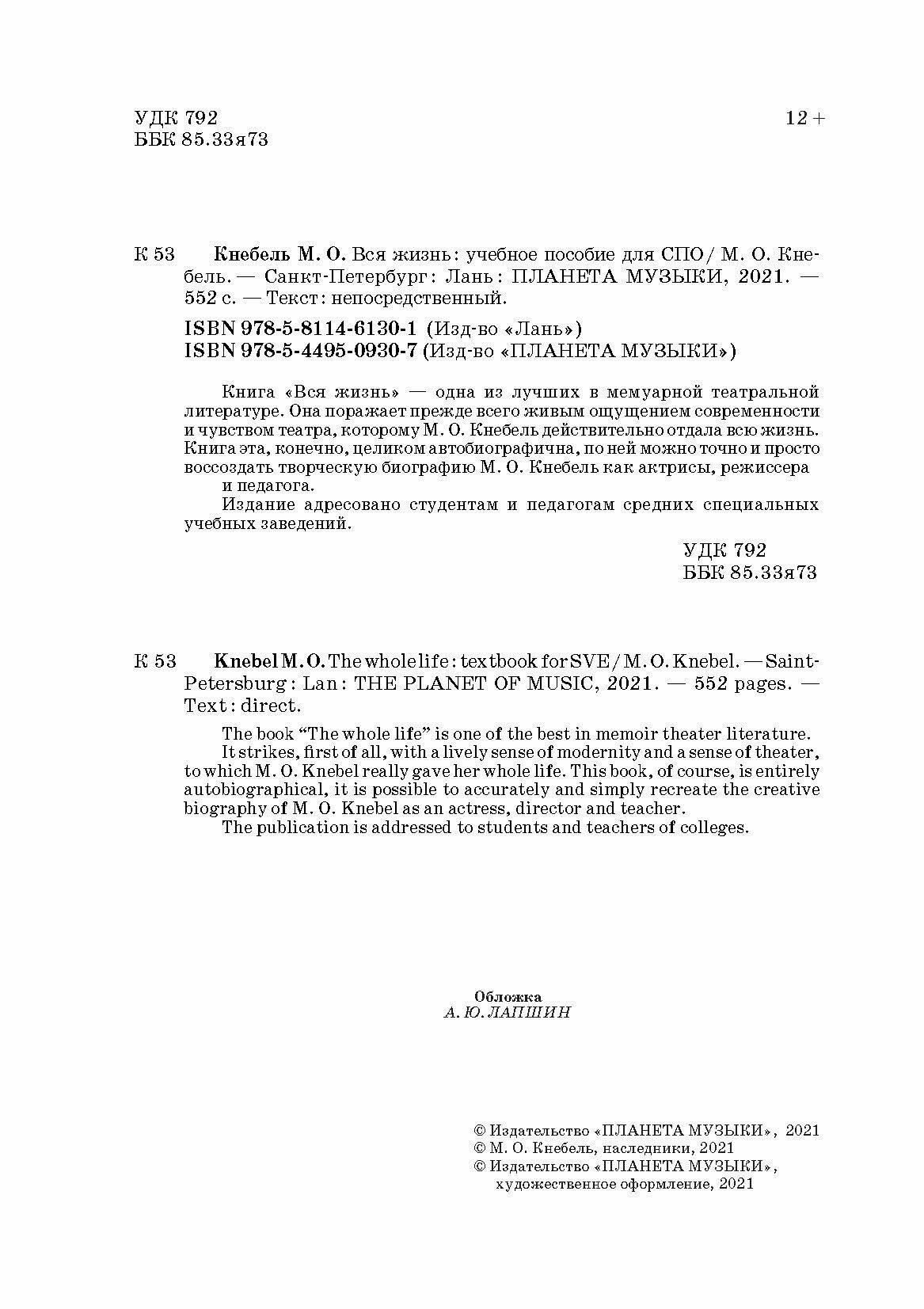 Книга: Вся жизнь.СПО (М. О. Кнебель); Издательство «Планета музыки», 2021