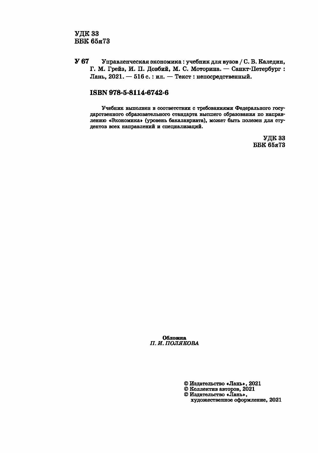 Управленческая экономика.Уч (Грейз Георгий Маркович, Каледин Сергей Викторович, Добвий Ирина Павловна); Лань, 2021