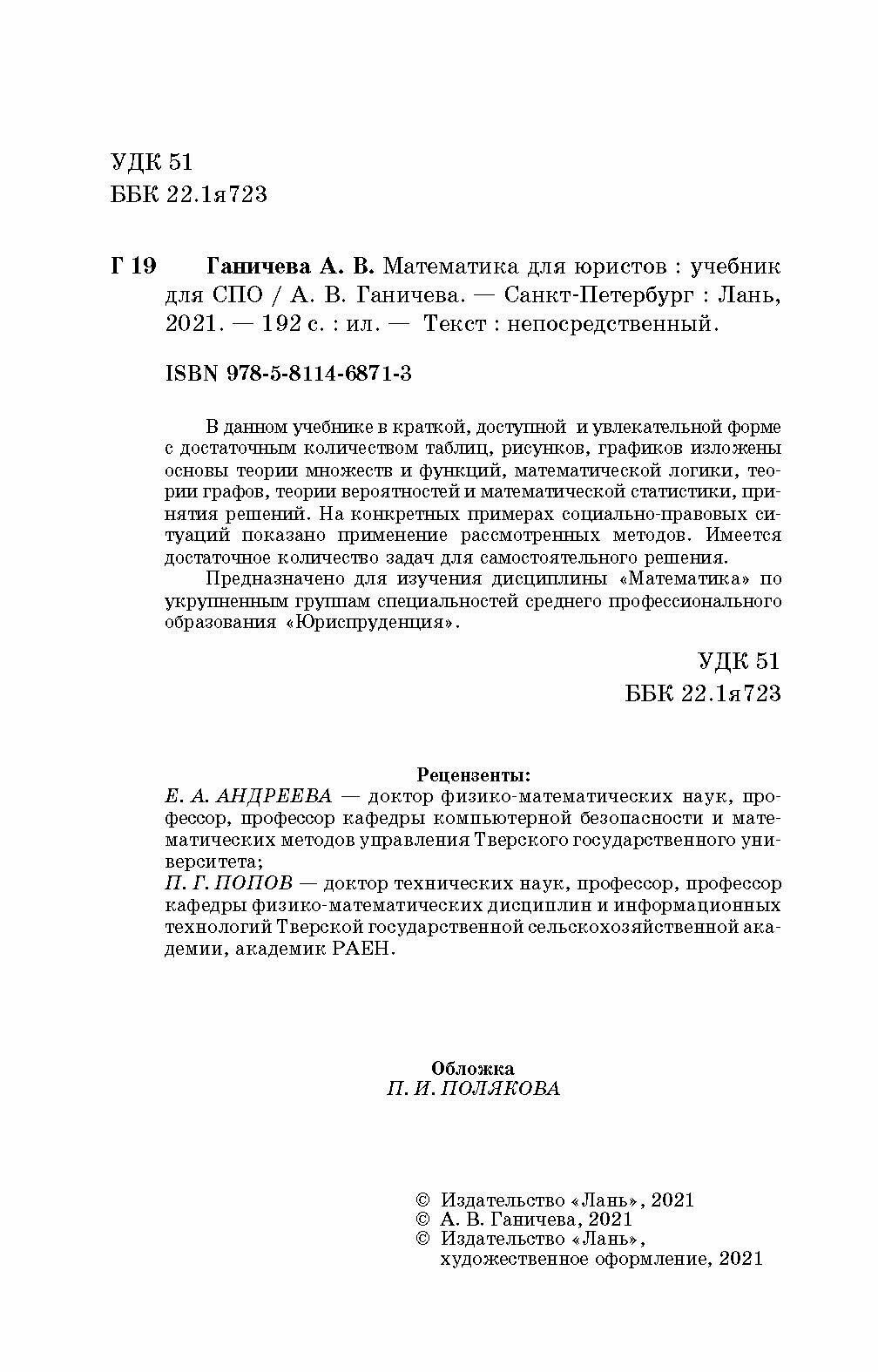 Математика для юристов.Уч.СПО (А. В. Ганичева); Издательство ЛАНЬ, 2021