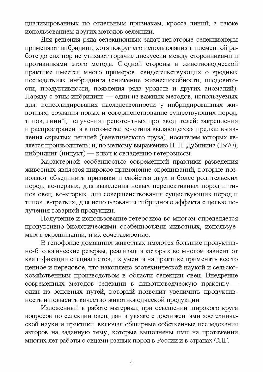 В работе рассмотрены: состояние генофонда пород овец в РФ; популяционно-генетические параметры овец; методы определения племенной ценности животных, особенности отбора и подбора по комплексу продуктивно-биологических показателей; обширные данные о результатах использования инбридинга в селекционном процессе; результаты скрещиваний для создания новых и совер-шенствования существующих пород овец; условия получения и реализации эффекта гетерозиса.