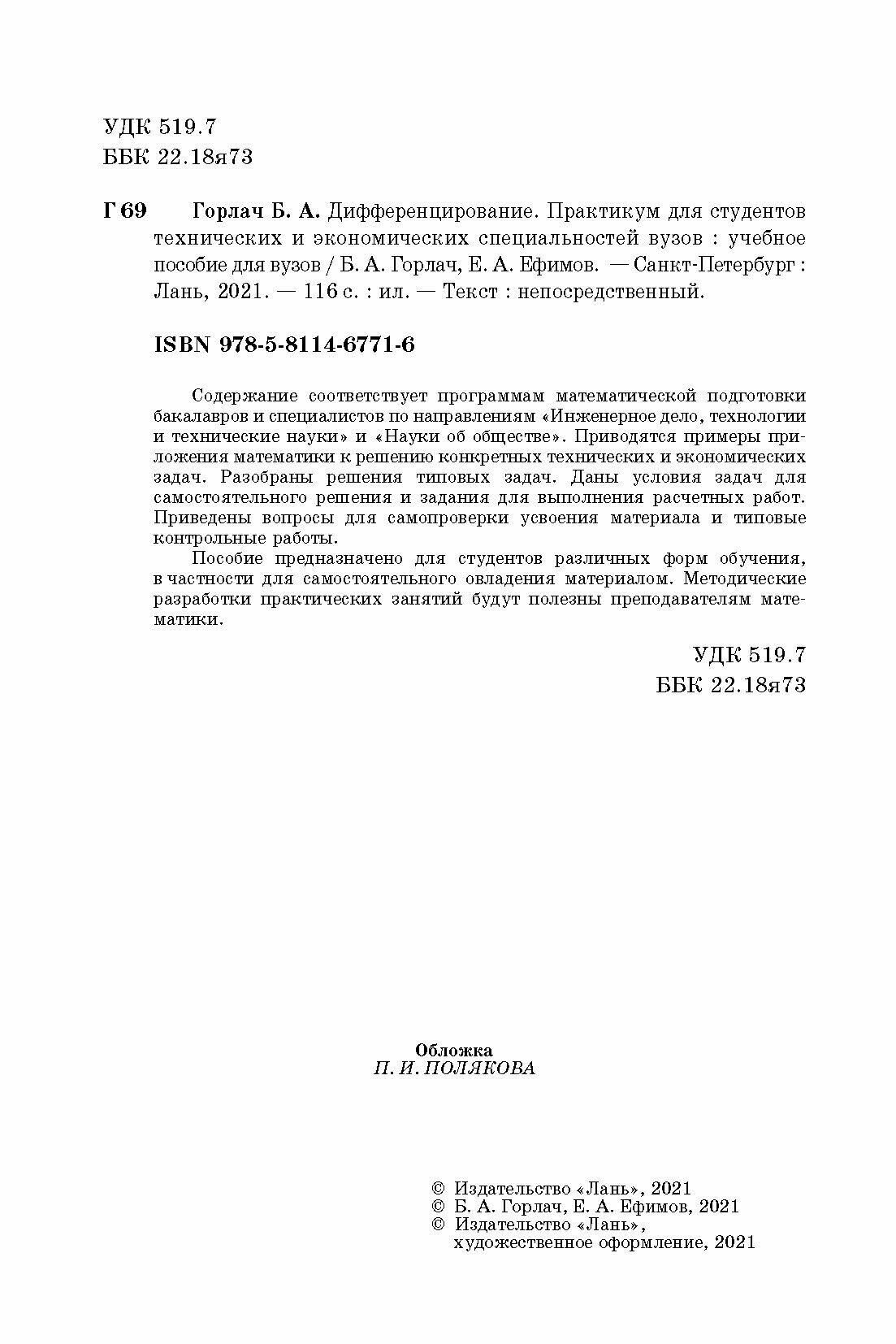 Дифференцирование.Практ.для тех.и эконом.спец.Уч.п (Горлач Борис Алексеевич, Ефимов Евгений Александрович); Лань, 2021