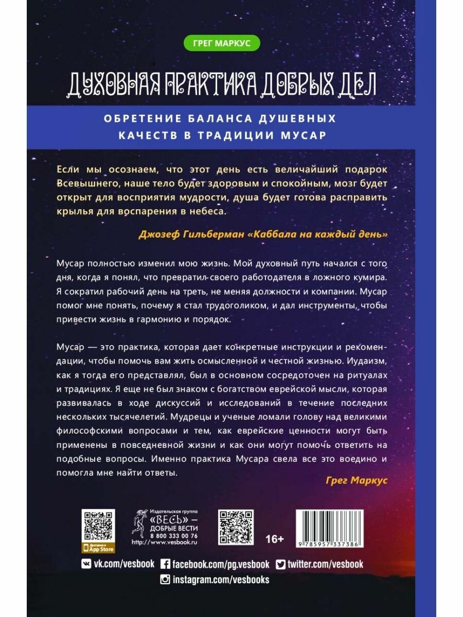 На сегодняшний день товар «Книга: Духовная практика добрых дел. Обретение баланса душевных качеств в традиции Мусар (Маркус Г.); Весь, 2021» можно купить с кешбеком в 4 магазинах: book24, Буквоед, Читай-город, Яндекс.Маркет