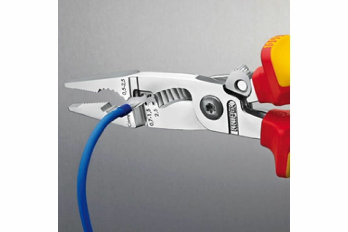 Одни клещи совмещают в себе сразу 5 функций: гладкие захватные губки для захвата отдельных жил без их повреждения; профилированные захватные губки и выемка для захвата плоского и круглого материала; отверстия для удаления изоляции для проводов 0,7–1,5 мм² и 2,5 мм²; опрессовочное гнездо для концевых гильз 0,5–2,5 мм²; ножницы для резки с прецизионными лезвиями (индуктивной закалки) для медного и алюминиевого кабеля до 5 x 2,5 мм² / Ø 15 мм. Специальная инструментальная сталь особого качества, кованая, закалённая в масле.