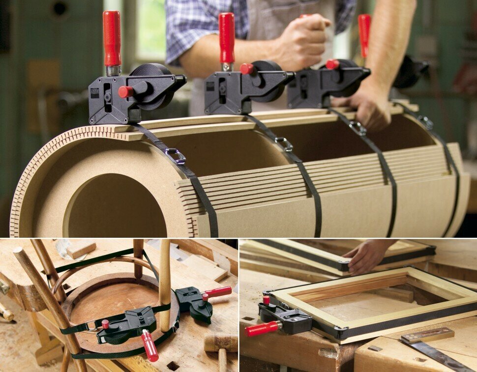 Ленточная струбцина — это инструмент, предназначенный для надёжного зажима различных материалов и деталей. Она имеет широкий диапазон зажима до 7 метров, что позволяет использовать её для работы с большими и сложными конструкциями.