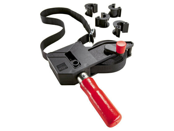 Струбцина оснащена двусторонней заправкой ленты, что обеспечивает равномерный зажим без перекосов. Лента изготовлена из прочного полиэстера, который устойчив к разрывам и износу.
