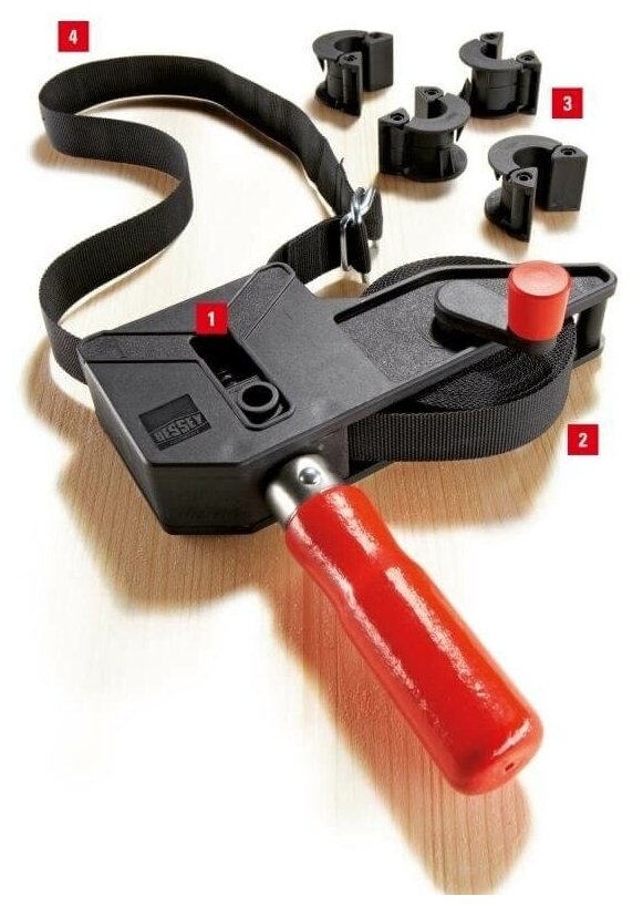 В комплект поставки входят 4 устройства для подгонки углов, что делает струбцину универсальным инструментом для широкого спектра задач.