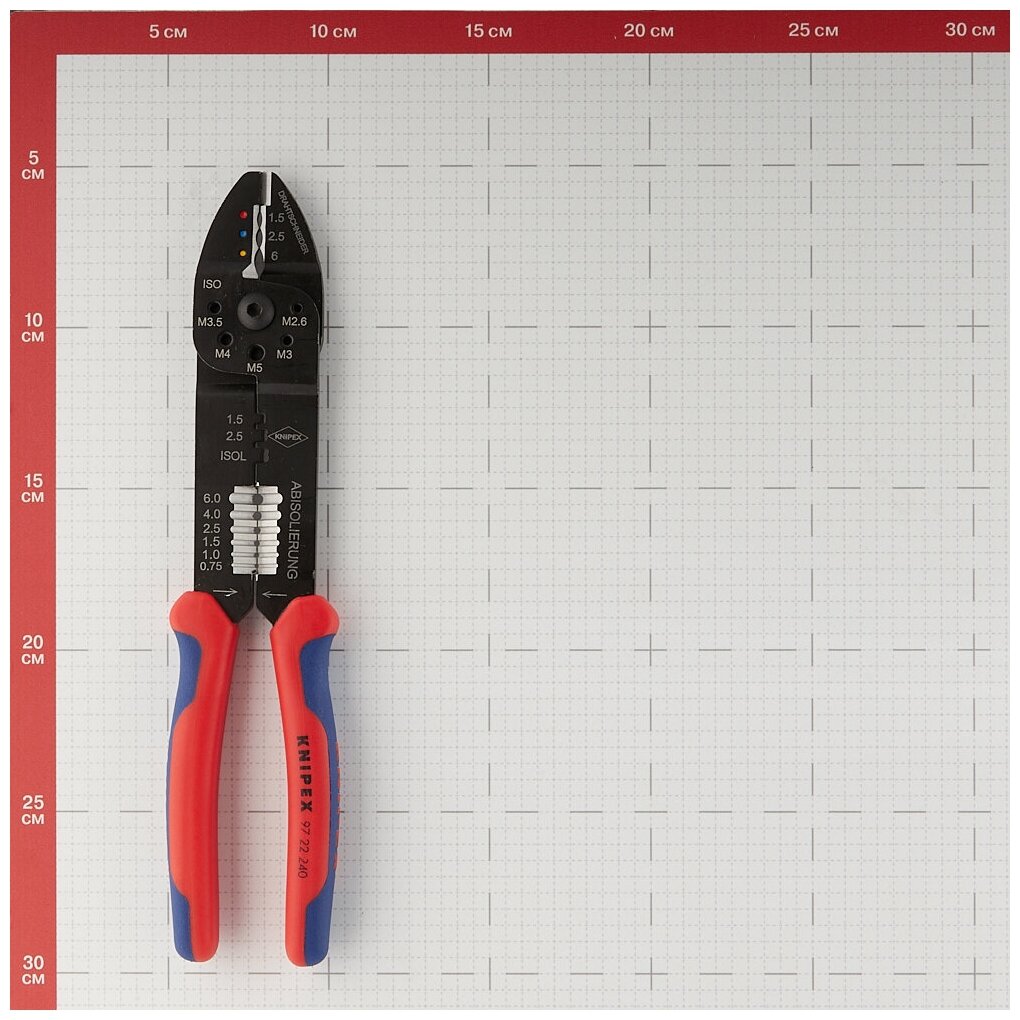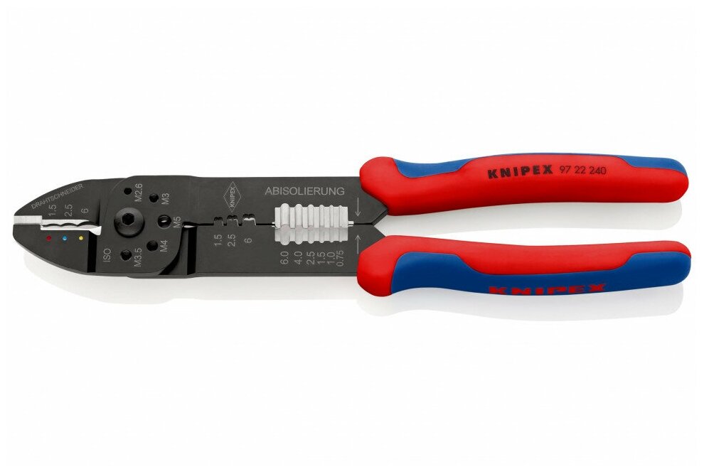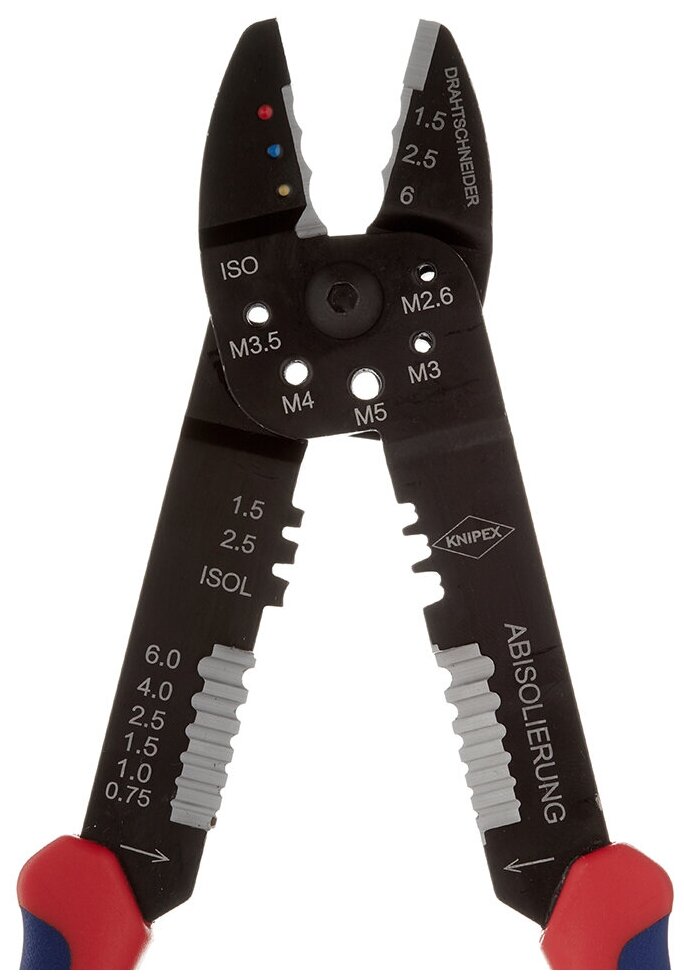 Клещи для резки кабелей, удаления изоляции с проводов и опрессовки изолированных и неизолированных кабельных наконечников и штекеров. С режущими выборками для резания медных или латунных резьбовых шпилек M 2,6; M 3; M 3,5; M 4 и M 5.