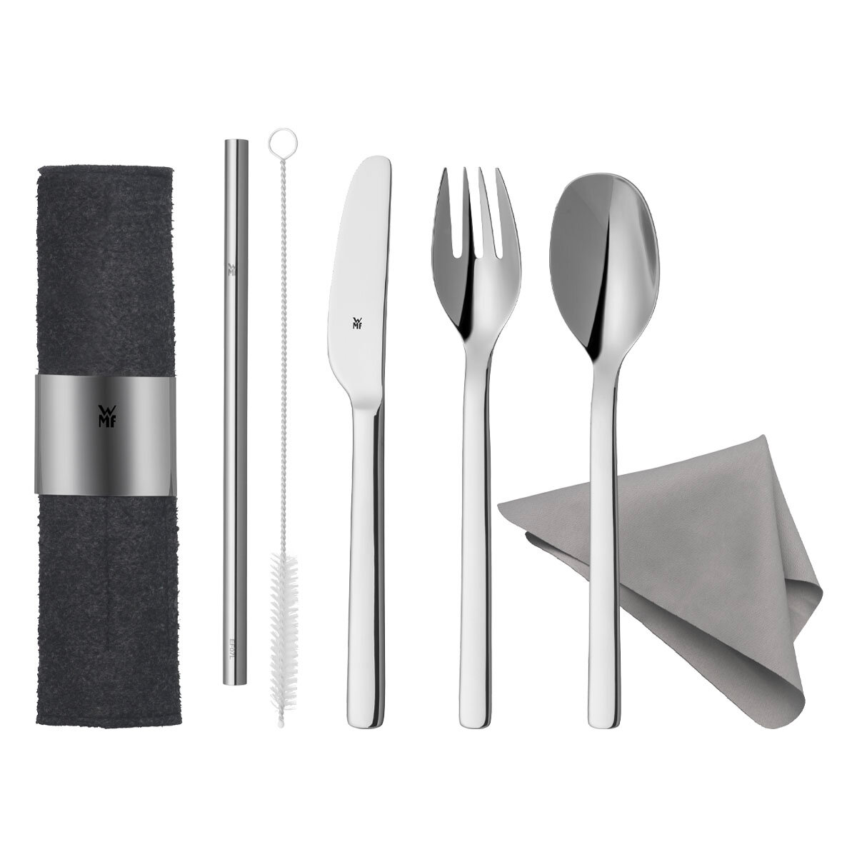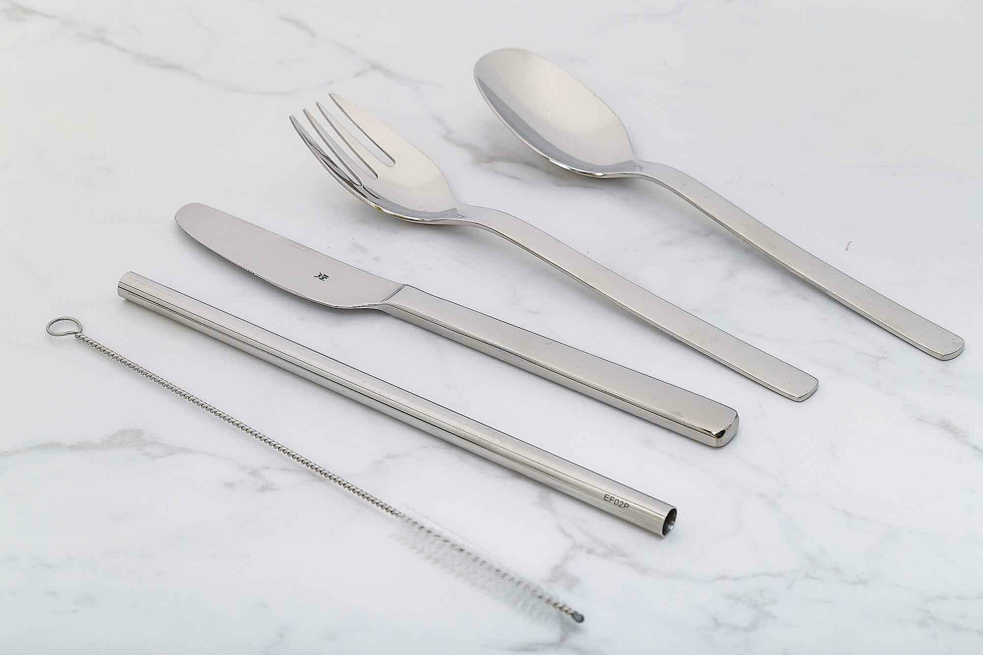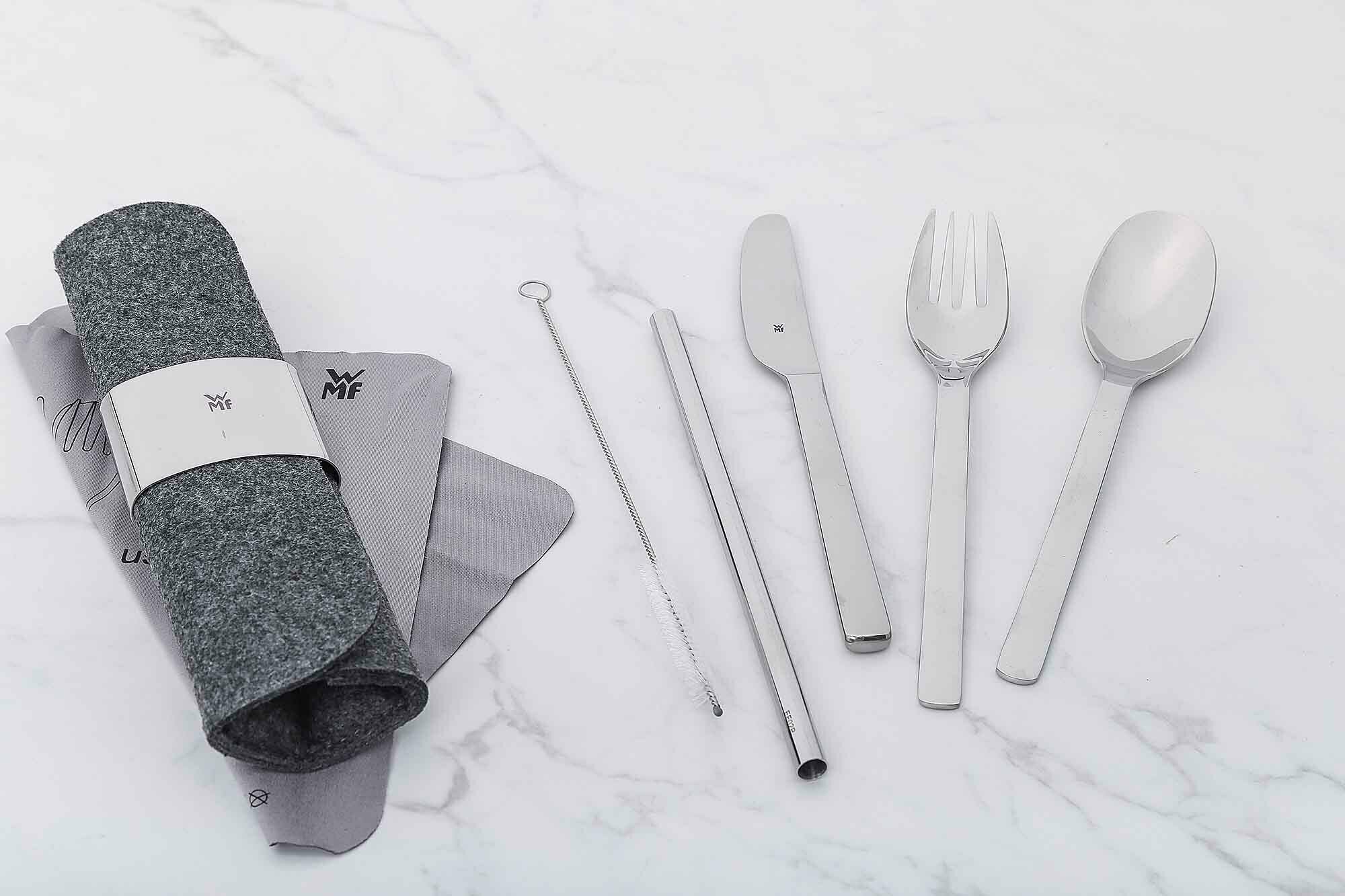 Набор выполнен из нержавеющей стали Cromargan® и заменяет одноразовые приборы и трубочки. От завтраков за рабочим столом, до обедов и напитков на вынос каждый предмет набора выполнен в эргономичном дизайне для удобного использования на ходу и легкого ухода.