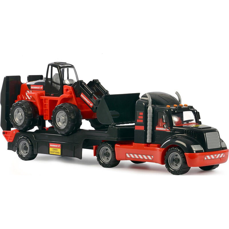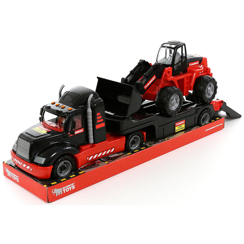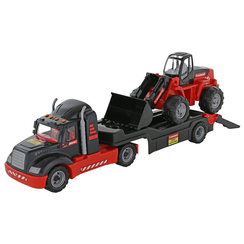 Автомобиль-трейлер и трактор-погрузчик, Полесье, 57129. Распланировать участок, предназначенный для возведения дома или другой интересной постройки, вам поможет трактор-погрузчик из серии Mammoet. А доставит его к месту ведения данных работ специальный автомобиль-трейлер из аналогичной серии. Особенности: - Набор состоит из автомобиля-трейлера и трактора-погрузчика. - Трейлер выполнен в черно-красной цветовой гамме и декорирован разнообразными наклейками. Он включает в себя кабину водителя и платформу для перевозки строительной и прочей техники. Чтобы обеспечить доступ к платформе, у машины имеется откидывающийся трап. Конструкция передвигается на шести колесах и является весьма устойчивой. - Погрузчик выполнен в аналогичных цветах и передвигается на двух крупных колесах с внушительным рисунком протектора. Для осуществления земляных работ его ковш сделан подвижным. - Оба автомобиля высоко детализированы и качественно собраны. Все их детали являются ударопрочными и изготовлены из высококачественного пластика, абсолютно безопасного для здоровья ребенка. - Набор относится к серии товаров от Полесье – Mammoet ;. В нее входят не только интересные модели специальной техники, но и различного рода инструменты, аксессуары, а также игровые конструкторы на аналогичную тематику. - Играя с данным набором, у ребенка будет активно работать фантазия, а также развиваться пространственное мышление и мелкая моторика рук, благодаря многообразию функциональных элементов.