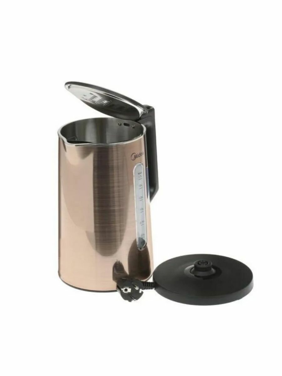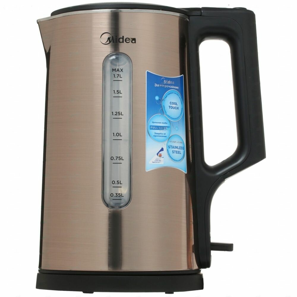 Электрочайник Midea в эффектном корпусе бронзового цвета из нержавеющей стали – симпатичное и практичное решение для домашней или офисной кухни. За раз представленная модель позволяет кипятить до 1.7 л воды за счет скрытого нагревательного элемента мощностью 2200 Вт из нержавеющей стали. Шкала уровня жидкости позволяет наливать столько водны, сколько необходимо для чаепития на данный момент. Нейлоновый фильтр в носике препятствует попаданию накипи в чашки. Модель максимально безопасна в использовании: ее корпус не нагревается снаружи, а сам чайник защищен от перегрева и не включается при отсутствии воды. Длина сетевого шнура модели составляет 0.8 м. Электрочайник Midea вращается на подставке вокруг своей оси, поэтому брать его удобно, подходя с любой стороны.