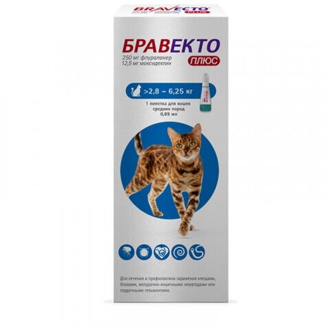 Бравекто Плюс используется для лечения и профилактики заражения кошек - иксодовыми клещами, блохами, желудочно-кишечными нематодами (4-я личиночная стадия, неполовозрелые и взрослые особи), сердечными гельминтами, вызывающими дорофиляриоз, а также при лечении кошек при отодектозе. Применяется так же в комплексной терапии при лечении аллергического дерматита, который вызван блохами. Препарат применяют против клещей или блох при одновременном заражении еще одним или несколькими целевыми паразитами.