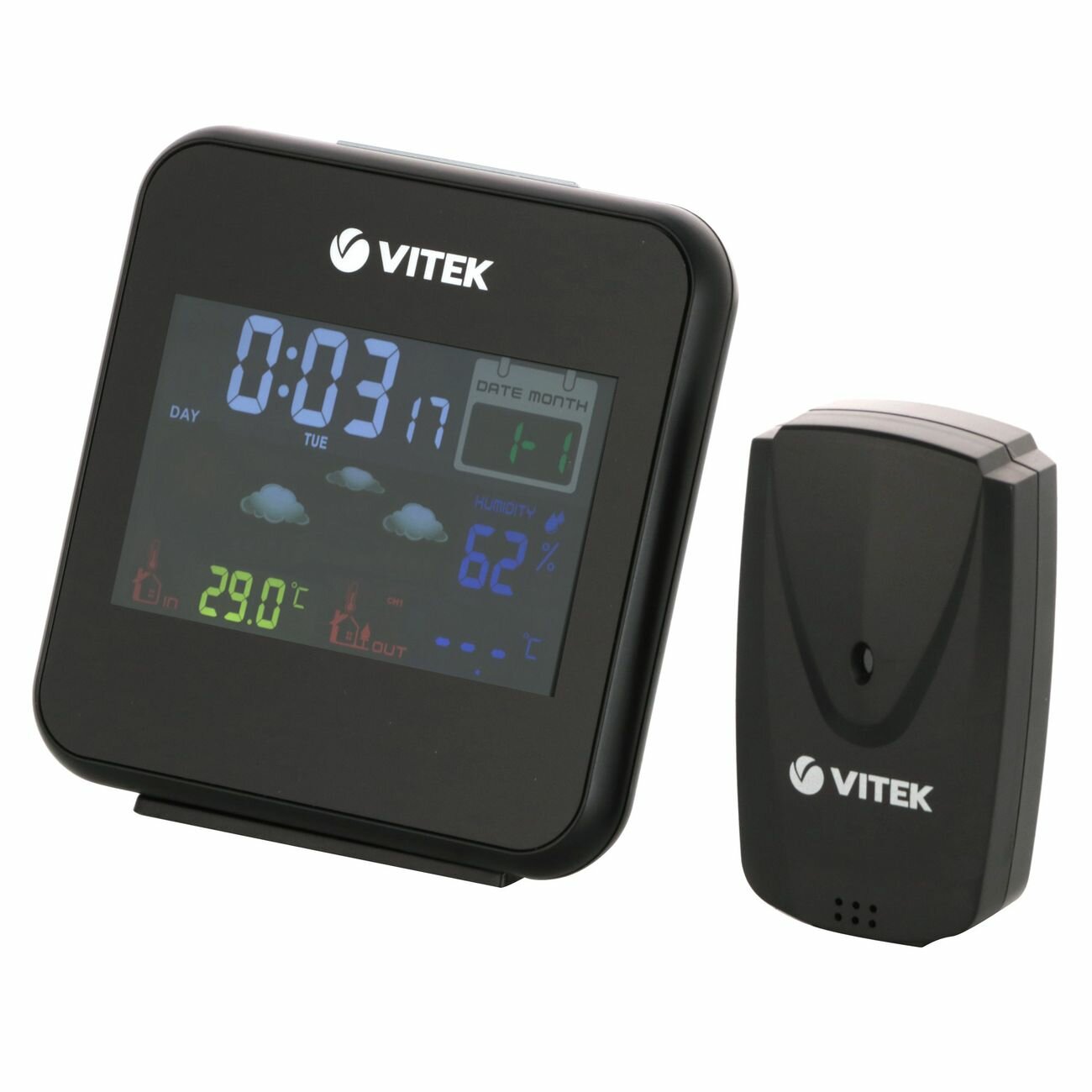 Vitek – компактная метеостанция, которой просто и удобно пользоваться.информативностьЭта модель состоит из двух блоков – базового и внешнего, предназначенного для установки за пределами помещения. В них встроены датчики, сообщающие температуру и относительную влажность.удобствоПолученные данные выводятся на цветной ЖК-экран. Большие, хорошо читаемые буквы и понятные пиктограммы позволяют быстро составить общее представление о том, что стоит надеть перед выходом из дома. Также на экране отображается время.дополнительные возможностиВстроенный календарь пригодится, если понадобится уточнить дату или день недели. Благодаря будильнику вы вовремя проснётесь, не опоздаете на работу и не пропустите важную встречу.