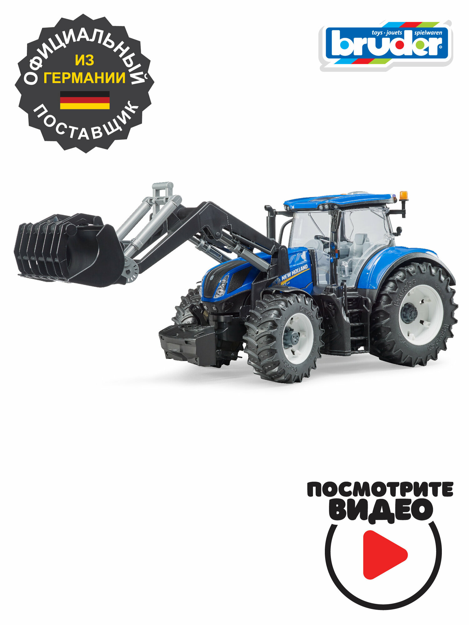 Современное сельское хозяйство активно использует универсальные и прочные трактора, такие как New Holland T7.315, которые можно применять для тяги, обработки земли, пакетирования или транспортировки. Предоставленная модель тягача является точной копией оригинальной машины. Остекление кабины выполнено из прозрачного и стойкого пластика, открываются двери и капот (есть доступ к двигателю). Встроенный маятниковый механизм в переднем мосту и мощные колеса с рельефными протекторами обеспечивают отличную управляемость и комфорт вождения. Колеса можно снять для ремонта или усилить дополнительными шинами (артикул 03-317), чтобы увеличить проходимость трактора. К регулируемому заднему блоку сцепления можно подсоединять все прицепы из коллекции Bruder. Для более удобного управления трактором предусмотрена дополнительная рулевая колонка. Спереди тягач оборудован полнофункциональным фронтальным погрузчиком. Для большей убедительности можно добавить фигурки работников (артикула 60-006 и 60-007). Игрушка, размерами 46 х 17,5 х 20,5 см, выполнена из ударопрочного пластика, поэтому трактор можно брать с собой для игры на улице. Рекомендуется детям возрастом от 3 лет. Безопасность Немецкие производители игрушечного транспорта с особым вниманием относятся к безопасности своих изделий для здоровья детей. Все машинки выполнены из прочного пластика и качественной резины, с применением стойких, нетоксичных красок. Игрушки гипоаллергенны.