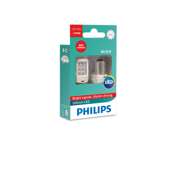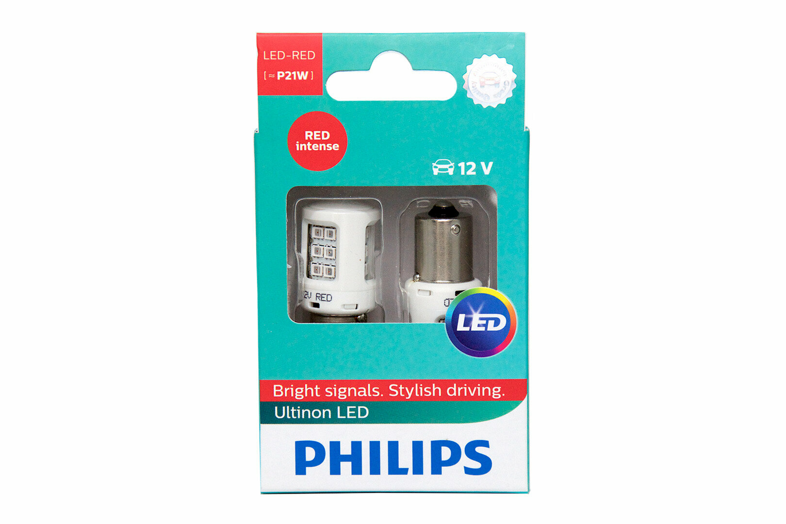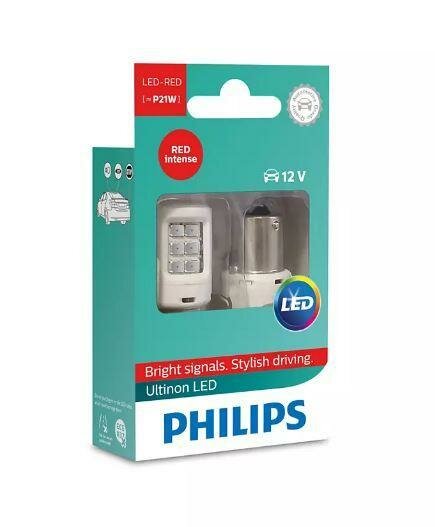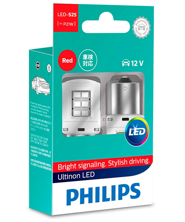 LED-S25 [~P21W]Количество ламп: 2 шт.12 В, насыщенный красныйСтоп-сигналы, противотуманные фонариУсовершенствуйте освещение, обновите стильНесомненно, основное назначение наружного освещения — обеспечение видимости. Кроме этого, оно придает автомобилю отличный внешний вид. Хотите обновить стиль, не вкладываясь в приобретение нового транспортного средства? Просто замените свое стандартное наружное освещение на светодиодное. Установите более яркие красные светодиоды в стоп-сигналы, оранжевые — в указатели поворотов, белые — в фонари заднего хода и габаритные огни. Подчеркните характер своего автомобиля со светодиодными сигнальными лампами Philips.Сигнальные лампы повышенной яркости для максимальной безопасности:Для соблюдения безопасности крайне важно сообщать о ваших маневрах на дороге. Чтобы избежать столкновения, другие водители должны знать о ваших намерениях. Благодаря яркому сигнальному освещению вас лучше видно, и, следовательно, вождение становится более безопасным. Все сигнальные светодиодные лампы Philips Ultinon LED (для фонарей заднего хода, габаритных огней и стоп-сигналов) гарантируют высокую эффективность работы, и благодаря им у других водителей будет больше времени среагировать на ваши действия.Моментально включающиеся стоп-сигналы гарантируют больше безопасности при резком торможении:Светодиодные лампы включаются моментально, в отличие от обычных ламп накаливания, которым требуется некоторое время, чтобы загореться и достичь максимальной эффективности. Эти доли секунды имеют значение при резком торможении. Например, при скорости 100 км/ч разницу в скорости реакции, составляющую всего четыре десятых секунды, можно приравнять к дополнительным 11 метрам расстояния между автомобилями — это примерная длина 2,5 автомобилей. Благодаря светодиодным лампам Philips водитель автомобиля позади вас моментально узнает о том, что вы собираетесь затормозить.