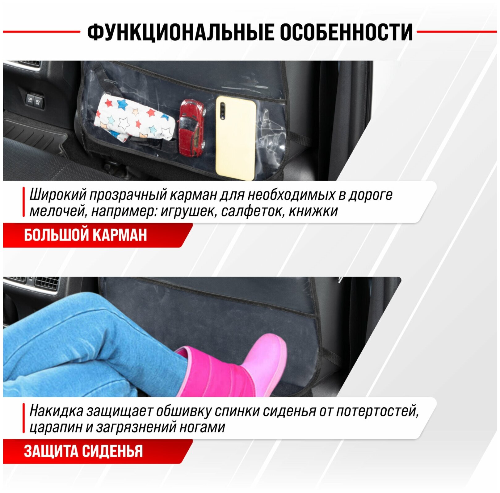 Совмещает в себе функции органайзера и защиты спинки сиденья. Позволяет компактно разместить все необходимые автомобилисту инструменты и аксессуары: от отвертки до детских книг. При этом надежно защищает сиденье от загрязнений и повреждений.