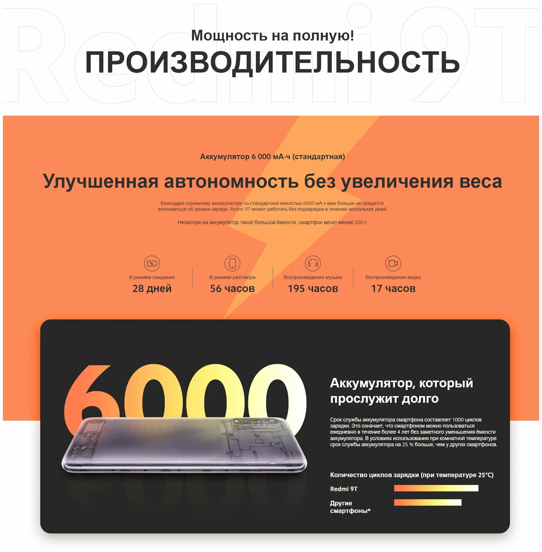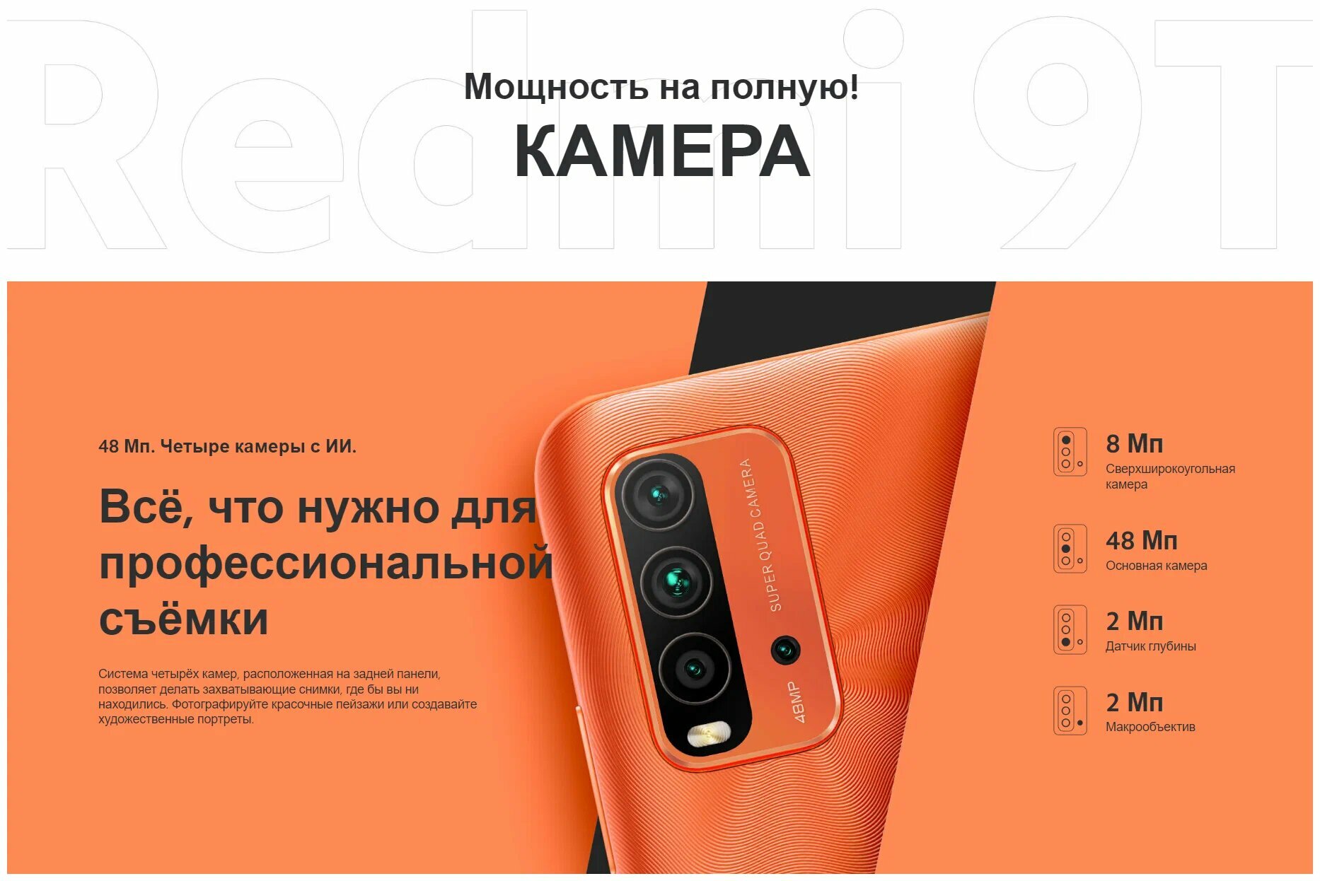 ЯРКИЕ ЦВЕТА 9T сделает жизнь ярче. Специальная текстура на задней панели переливается, источая завораживающее сияние. Выберите один из четырех цветов: "Синие сумерки", "Оранжевый рассвет", "Морская волна" или "Серый карбон". ВСЕГДА КАК НОВЫЙ Специальная текстура задней панели препятствует появлению отпечатков пальцев. Защита от брызг — для безопасности устройства в любую погоду. Встроенный в кнопку питания сканер отпечатков пальцев повышает удобство и надежность использования. МП. ЧЕТЫРЕ КАМЕРЫ С ИИ Система четырех камер, расположенная на задней панели, позволяет делать захватывающие снимки, где бы вы ни находились. Фотографируйте красочные пейзажи или создавайте художественные портреты. Redmi 9T — это все, что нужно для профессиональной съемки. СЛЕДИТЕ ЗА ДВИЖЕНИЕМ ВРЕМЕНИ Режим "Таймлапс" позволяет запечатлеть течение времени прямо на видео. Записывайте облака, движущиеся по небу, или создайте забавное видео уборки вашего дома. УЛУЧШЕННАЯ АВТОНОМНОСТЬ БЕЗ УВЕЛИЧЕНИЯ ВЕСА Благодаря огромному аккумулятору 6000 мАч вам больше не придется волноваться об уровне заряда. Redmi 9T может работать без подзарядки в течение нескольких дней. Несмотря на аккумулятор такой большой емкости, смартфон весит менее 200 г. АККУМУЛЯТОР, КОТОРЫЙ ПРОСЛУЖИТ ДОЛГО Срок службы аккумулятора смартфона составляет 1000 циклов зарядки. Это означает, что смартфоном можно пользоваться ежедневно в течение более 4 лет без заметного уменьшения емкости аккумулятора. В условиях использования при комнатной температуре срок службы аккумулятора на 25 % больше, чем у других смартфонов. БЫСТРЫЙ И ЭНЕРГОЭФФЕКТИВНЫЙ -ядерный процессор Snapdragon 662 обеспечивает высочайшую производительность с низким энергопотреблением и защитой от перегрева. Встроенная память стандарта UFS 2.2 позволяет запускать приложения и копировать файлы с молниеносной скоростью. Это также влияет на скорость съемки и обработки фото в сверхвысоком разрешении (устройства со 128 ГБ встроенной памяти оснащаются накопителем стандарта UFS 2.2, а устройства с 64 ГБ встроенной памяти — накопителем стандарта UFS 2.1). ВИДНА КАЖДАЯ ДЕТАЛЬ Благодаря разрешению Full HD+ вы получите совершенно новые визуальные ощущения от чтения новостей, просмотра видео и социальных сетей. Высокое разрешение 6,53-дюймового дисплея обеспечивает четкость изображения и комфортный просмотр с минимальной нагрузкой на глаза. УСЛЫШЬТЕ МУЗЫКУ, ПОЧУВСТВУЙТЕ РИТМ Наслаждайтесь великолепным качеством звучания динамиков смартфона. Глубокий бас подчеркивает ритм, а улучшенные высокие частоты позволяют полностью погрузиться в виртуальный игровой мир или в просмотр видео.
