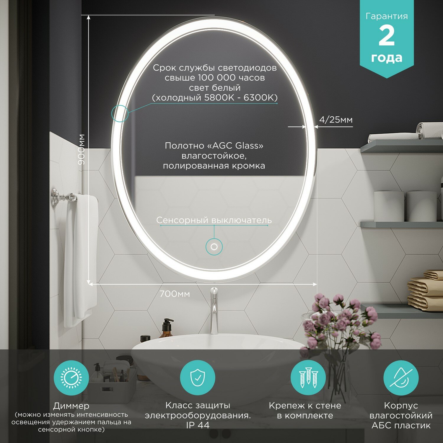 Срок службы диодов - 100 000 часов. Зеркало влагостойкое и защищено от попадания случайных брызг и капель воды