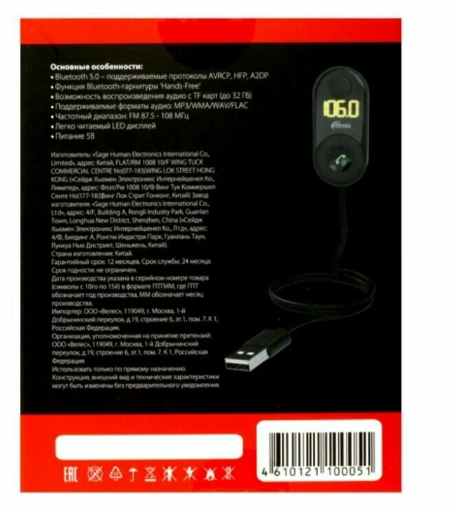 FM-трансмиттер Ritmix FMT-B400 отличается функциональностью и удобством использования и позволяет транслировать на стереосистему автомобиля входящие звонки, поступающие на смартфон, а также воспроизводить музыку за счет возможности установки карт памяти емкостью до 32 Гб. Для подключения устройств используется встроенный модуль Bluetooth 5.0. Благодаря данной модели вы сможете не только оставаться на связи с близкими и коллегами во время управления транспортным средством, но и наслаждаться любимой музыкой. На лицевой панели расположен микрофон, LED-дисплей, а также механические кнопки для управления устройством. FM-трансмиттер Ritmix FMT-B400 выполнен в корпусе из качественного и устойчивого к износу пластика, отличается компактными размерами, а также строгим и лаконичным дизайном, за счет чего легко впишется в интерьер салона. Устройство монтируется на приборную панель автомобиля. Питание FM-трансмиттера Ritmix FMT-B400 осуществляется от USB-порта в машине.