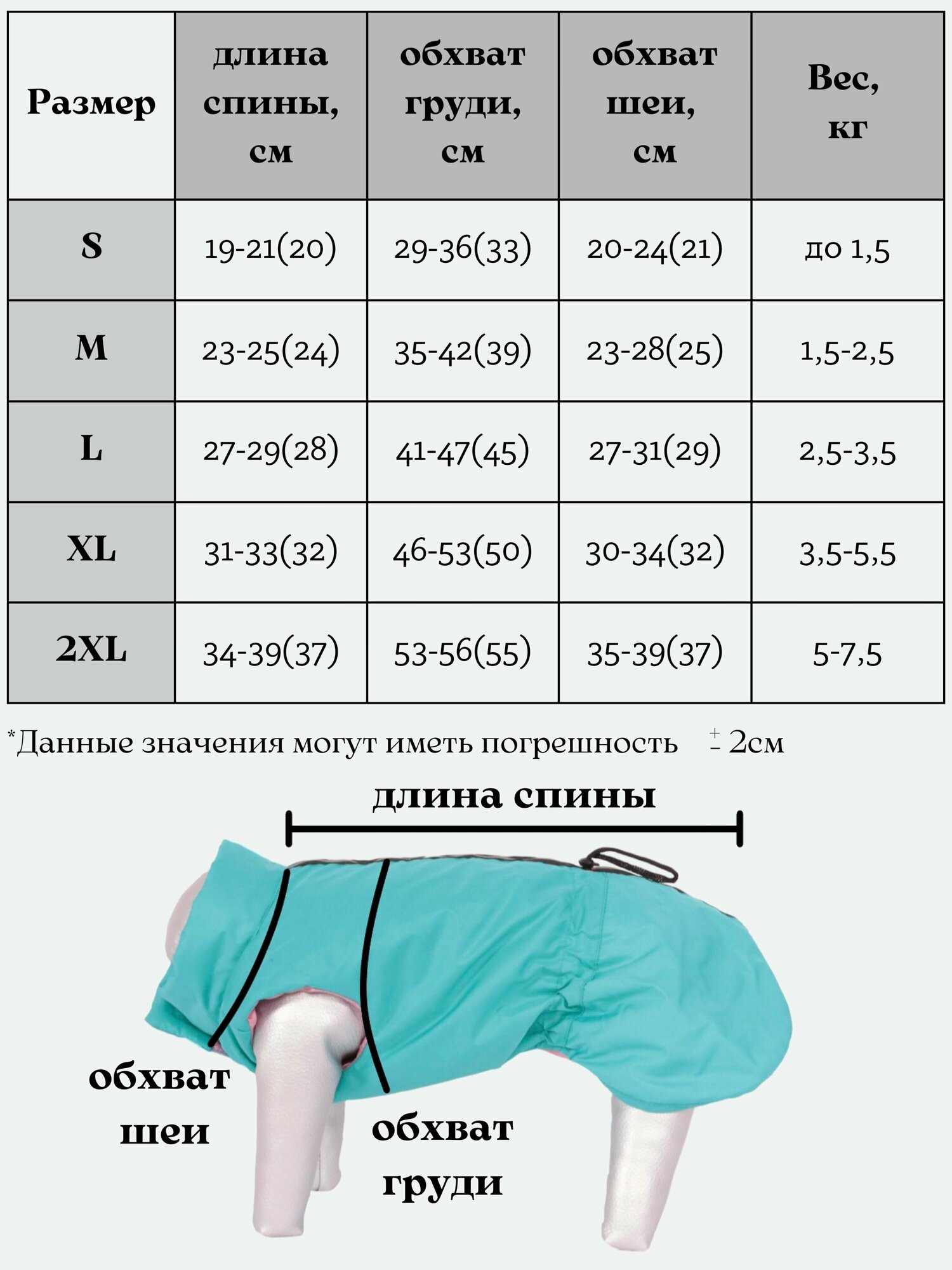 Демисезонная попона для собак от Yoriki на тонком синтепоне, с подкладом из таффеты (гладкий). Верх выполнен из мягкой водо-ветроотталкивающей плащевки, без манжета. Застежка на животе кнопки металлические. Кулиска и шнур на талии регулируют объем.На спине светоотражающая полоса.Пол: УнисексУход: стирка автомат деликатный режим, отпаривание.Длина по спине M - 24 см, L - 28 см, XL - 32 см (возможна погрешность 1 см в сторону увеличения). Соответствие размера согласно весу собаки: М - от 1,5 до 2,5 кг, L - от 2,5 до 3,7 кг, XL - от 3,5 до 5 кг.