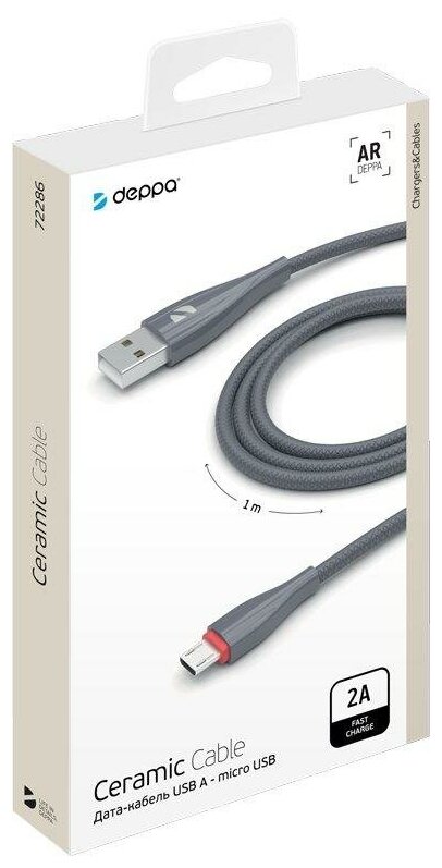 Дата-кабель Ceramic USB - micro USB, 1м, серый, Deppa (72286). Передача данных и заряд аккумулятора вашего устройства. Технические характеристики Материал оплетки: TPE Материал коннекторов: ABS пластик Длина кабеля: 1м Ток нагрузки: 2A Протокол: USB 2.0 Скорость передачи данных: до 480 Мбит/сек Цвета Черный, серый, красный Совместимость Планшеты, смартфоны и другие цифровые Устройства с разъемом micro USB