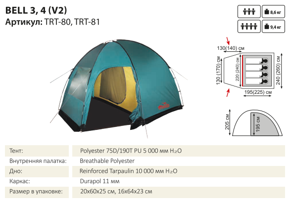 Палатка Bell 3 (V2) для семейного отдыха и отдыха большой компанией. Высота внутри 195 см. Один вход и один тамбур.