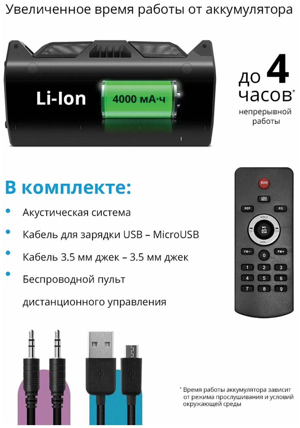 | Прочие особенности и свойства | Bluetooth 5.0, , Светодиодная подсветка, , Беспроводной пульт ДУ, , True Wireless Stereo (TWS) — возможность сопряжения двух отдельных колонок по Bluetooth в акустическую 2.0 систему., , Встроенный FM-приемник, Встроенный тюнер превращает колонку в полноценный радиоприемник. Вы всегда сможете послушать ваши любимые радиопередачи или музыку., , Поддержка USB-накопителей и MicroSD-карт, Наличие слота для карт памяти стандарта Micro-SD или USB дает возможность воспроизведения музыкальных файлов без использования компьютера. Достаточно вставить в слот карту с записанными на ней WAV- или MP3-файлами – и можно наслаждаться музыкой., , Разъем для микрофона, Режим караоке - микрофонный вход с регулировкой громкости и эхо-эффектом., , Дополнительный AUX-аудиовход, С помощью AUX-входа и кабеля 3,5-мм джек — 3,5-мм джек колонки можно подключить к компьютеру (плееру, мобильному телефону) и использовать как мощный динамик., , Удобная ручка для переноски, , Увеличенное время работы от аккумулятора, , Возможность горизонтального и вертикального расположения колонки |