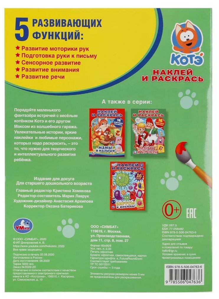 Раскраска с наклейками «Котэ. Котёнок и волшебный гараж» из серии «Наклей и раскрась» ТМ «УМка» обязательно понравится вашему ребёнку:— тщательно прорисованные картинки для раскрашивания (жирный контур)— 16 цветных наклеекРебёнку предлагается посмотреть на яркую наклейку, раскрасить свою картинку также или подобрать цвета по-своему. Раскраска из серии «Наклей и раскрась» с 16-ю наклейками в комплекте облегчит процесс обучения малыша и подготовит его руку к письму. Яркие наклейки и разнообразные интересные иллюстрации сделают рисование более увлекательным.Игровые занятия с раскраской ТМ «УМка» способствуют развитию:— мелкой моторики рук— памяти— внимания— творческого мышления— усидчивостиОбъём: 16 стр. Формат: 214х290 мм (А4).Материал: офсетная бумага.