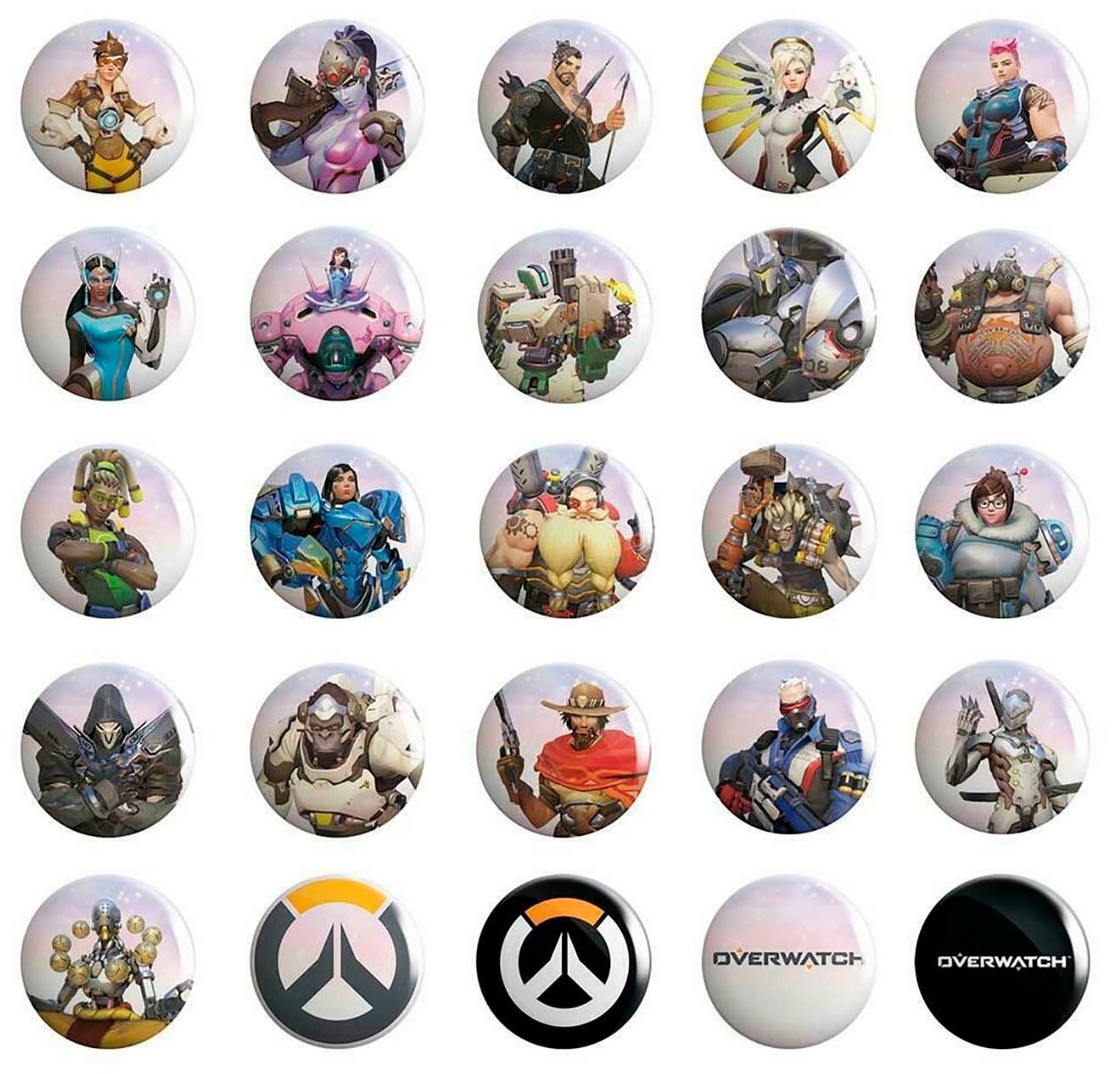 Набор Overwatch – это 50 оригинальных значков, созданных по мотивам популярной компьютерной игры. На них изображены наиболее запоминающиеся персонажи этой виртуальной вселенной и узнаваемые логотипы. на любой вкус Необычный аксессуар легко прикрепить к рюкзаку, сумке или футболке – так вы сможете легко выделиться в толпе и рассказать окружающим о своих увлечениях. Среди большого количества дизайнов выбирайте тот, который будет больше всего соответствовать стилю одежды и настроению. Значки выполнены из прочного металла.