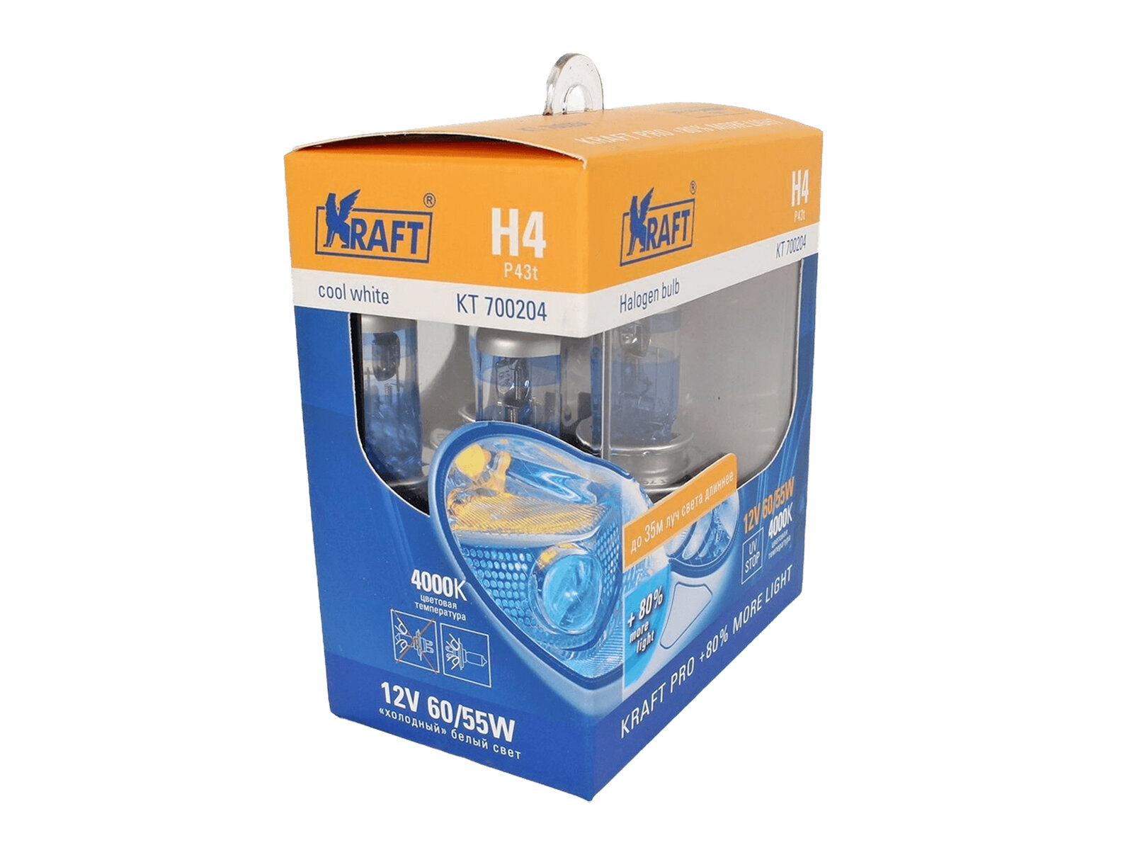 Автомобильная галогенная лампа головного света H4 12v 60/55w P43t Kraft Pro +80% more light 2шт. блистер . Автомобильные галогенные лампы головного света ТМ KRAFT (Крафт) отличаются оптимальным соотношением цены и качества. Интенсивный мониторинг технологий и материалов, четкий контроль на каждом этапе производства, в сочетании с простотой дизайна и активным использованием автоматизации процессов, позволяет предоставить качественный продукт по доступным ценам. Автолампы предназначены для применения в любых погодных условиях, обеспечивая комфорт и безопасность вождения, а специальное стекло колбы ламп, поглощающее большую часть ультрафиолетовых лучей, обеспечивает полную безвредность для пластиковых частей фар. Лампочки соответствуют всем предъявляемым требованиям технического регламента, правила №37 ЕЭК. На 80% больше света. Световой поток 1300Lm. Цветовая температура 4000К (холодный белый свет).