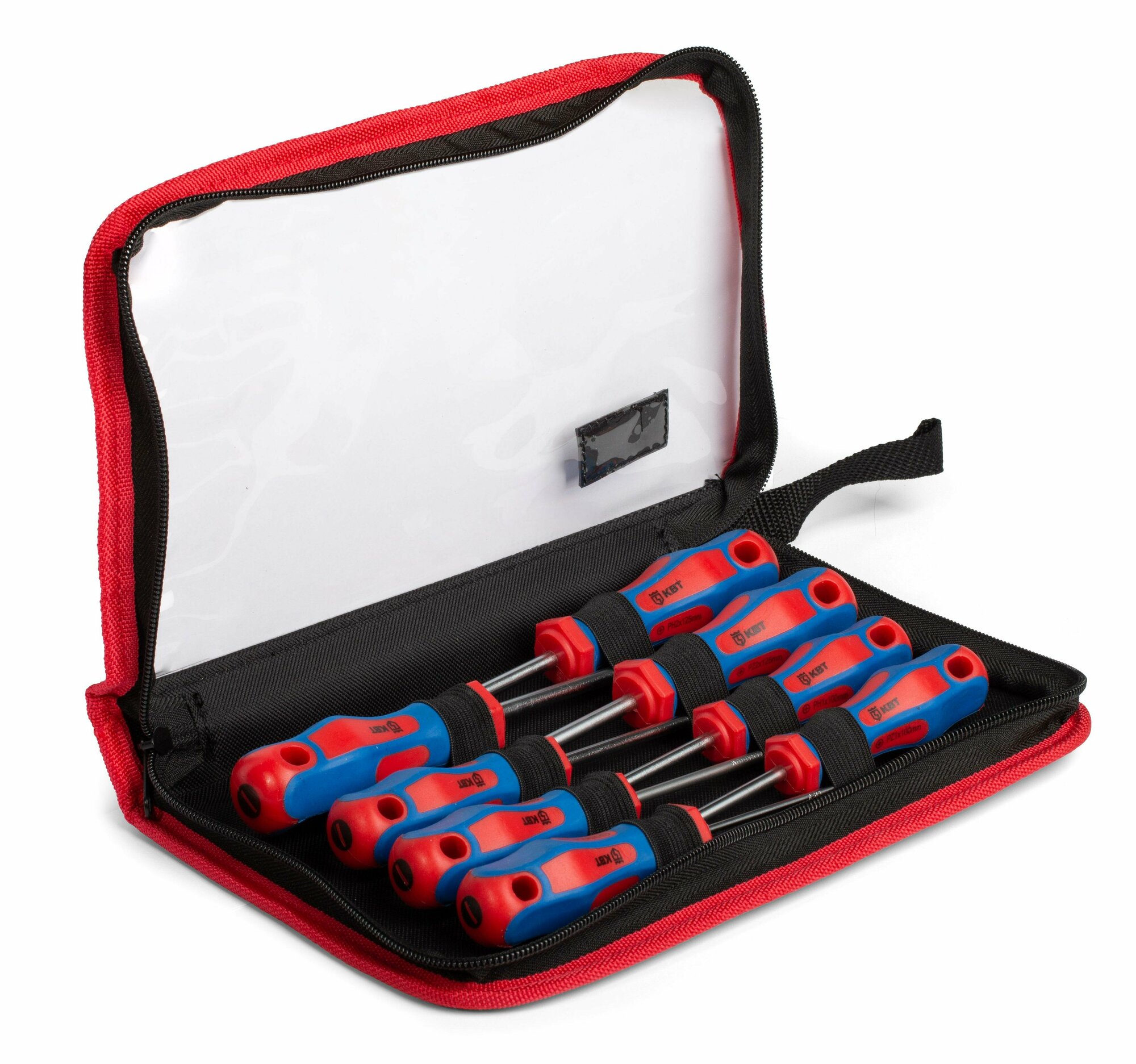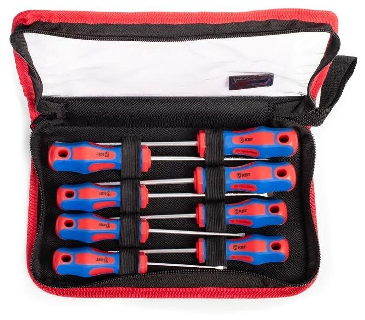 Набор отвёрток КВТ «Мастер» предназначен для слесарно-монтажных работ, включая сборку мебели, обслуживание приборов и другие задачи, где требуется работа с крепёжными элементами. В набор входит 8 отвёрток с шлицами SL (плоские), PH (крестовые) и PZ ( Pozidriv) распространённых размеровПреимущества Прочность и долговечность. Стержни отвёрток выполнены из хромованадиевой стали, которая обеспечивает высокую прочность и устойчивость к деформации Защита от коррозии. Шлицевые наконечники подвергнуты воронению, что защищает их от коррозии Эргономичные рукоятки. Двухкомпонентные рукоятки имеют анатомическую форму с выемками под пальцы, что обеспечивает удобный хват и предотвращает выскальзывание инструмента из ладони