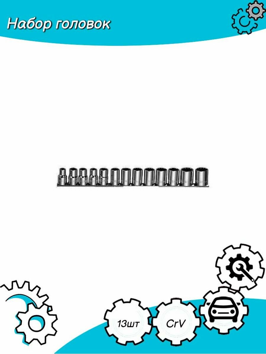 | Комплектация | 1/2"DR- Головки торцевые 12-ти гранные, 13 шт.10, 12, 13, 14, 15, 16, 17, 18, 19, 20, 21, 22, 24 мм. - Держатель "рельс". |