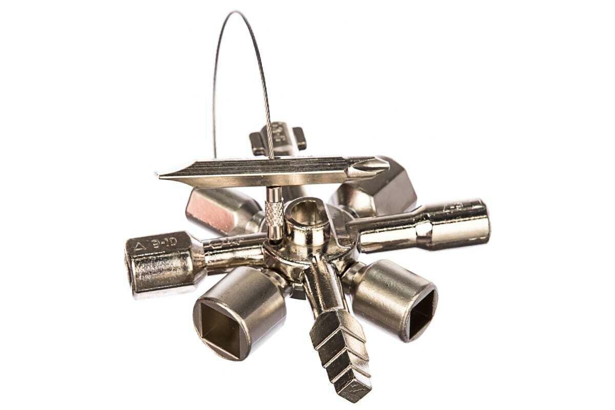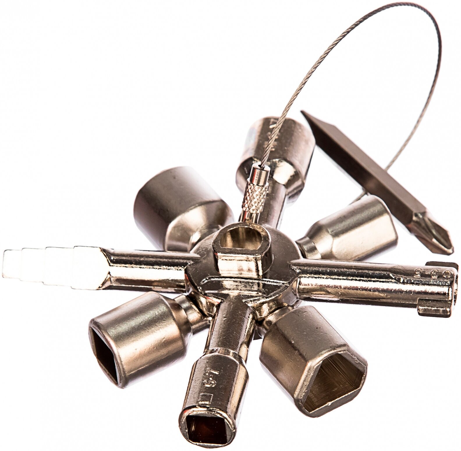 Ключ универсальный с 10 профилями предназначен для обеспечения доступа к различным инженерно-техническим устройствам, средствам коммуникации, канализации, вентиляции и электрораспределения. Специальные насадки могут служить в качестве ключей для включения/выключения различных приборов Ключ для электрошкафов КВТ 78069 представляет собой удобный инструмент, при помощи которого можно работать с 10-ю различными профилями замка. Простая форма и небольшие размеры заметно упрощают эксплуатацию изделия. Размеры: Квадрат 5/6, 7/6, 8/10, 11 мм; Треугольник 7, 8/9, 10/11, 12 мм; Спец ключ 6-9 мм; С лыской 6мм. Специалисты КВТ разработали самый удобный ключ: он состоит из двух крестовин с насадками, которые соединяются при помощи мощного магнита. Для отдельных работ есть бита (шлиц/PH2), закрепленная на тросике. Материал ключа: сплав с добавлением хрома и цинка, обеспечивающий твердость и коррозионную стойкость.