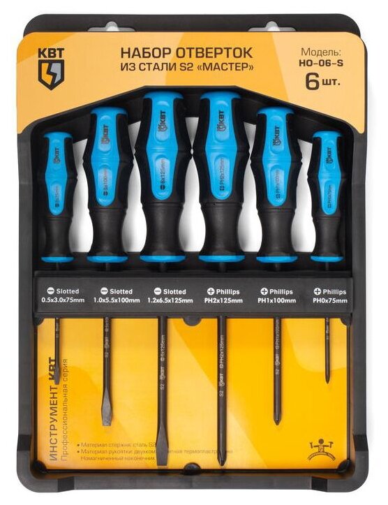 Набор отверток из стали S2 КВТ Мастер НО-06-S представляет собой набор качественных инструментов для монтажных и демонтажных работ. Все отвертки имеют намагниченные вороненые наконечники. Подходят для профессионального примененияПреимущества Стержни отвёрток КВТ Мастер НО-06-S выполнены из высококачественной инструментальной легированной стали S2 Покрытие стержня черное фосфатирование Двухкомпонентная рукоятка с мягкими прорезиненными вставками Маркировка на торце рукояток с обозначением типа профилей Специальная форма рукоятки, не позволяющая инструменту скатываться с наклонной поверхности