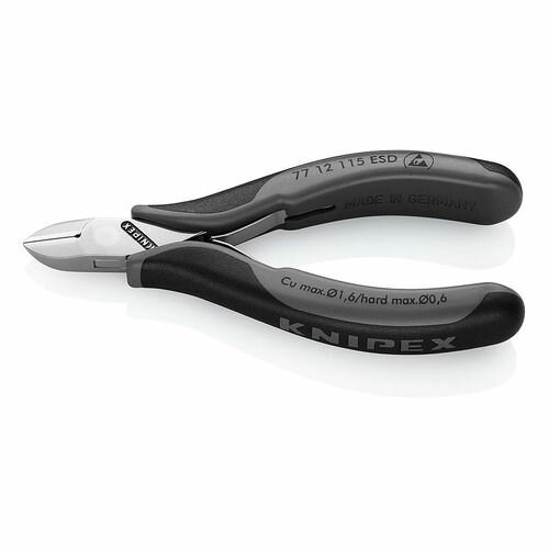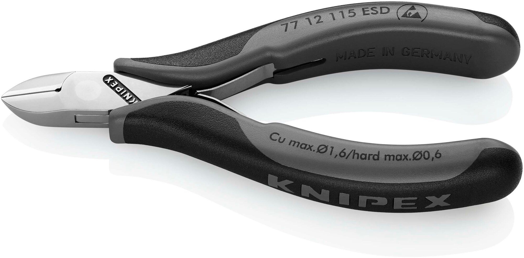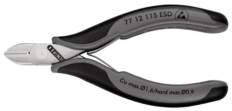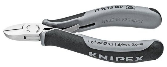 Компания KNIPEX — один из ведущих специализированных производителей шарнирно-губцевого инструмента в мире. Многие разработки компании запатентованы. Модели Knipex сочетают в себе новейшие технологии, многолетний опыт слесарного и кузнечного дела, высочайшее качество исполнения, надежность в каждой детали и повышенный срок гарантийной эксплуатации. Все инструменты компании изготавливаются исключительно на специализированных предприятиях Knipex в Германии и существенно превосходят многие аналоги. Для самых тонких монтажных и высокоточных работ в электронике и точной механике компания Knipex разработала специальную модель боковых кусачек . Основные характеристики модели: Инструмент изготовлен из высококачественной инструментальной ванадиевой стали, кованой и многократно закаленной в масле. Режущая часть бокореза оборудована устойчивым коробчатым безлюфтовым шарниром для больших нагрузок. Для удобства применения встроена плоская двуперая пружина с малым трением. Для удержания проволоки на случай отскока отрезанных кусков к режущей части встроен специальный зажим Прецизионные скругленные режущие кромки с небольшой фаской дополнительно закалены токами высокой частоты до твердости около 62 HRC по шкале Роквелла. Режущая часть имеет зеркальную полировку и в сочетании с тонкой масляной пленкой обеспечивает отличную защиту от коррозии, предотвращает появление трещин в покрытии, возникающих при отскакивании частиц хромового покрытия. Острые и точно режущие отшлифованные лезвия не тупятся, смыкаются чуть внахлест для максимальной долговечности. Бокорез данной модели легко справляется с мягкой проволокой диаметром сечения от 0,3 мм до 1,6 мм, проволокой средней твердости до 1,2 мм в диаметре, высокой твердости — до 0,6 мм в диаметре. Длина инструмента составляет 115 мм, вес всего 67 гр. Эргономичная конструкция ручек создана для удобства применения в любой руке и дополнительно увеличивает силу нагрузки. Рукоятки вложены в многокомпонентные электроотводящие чехлы с рассеянием, представленные в стильной серо-черной гамме, чехлы удобно лежат в руке, исключая выскальзывание.