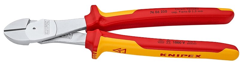 74 06 250 Бокорезы особой мощности для самых высоких продолжительных нагрузок. высокая режущая способность при меньших затратах усилий, благодаря оптимальной согласованности угла режущих кромок, передаточного отношения рычагов и эргономичной конструкции ручек. прецизионные режущие кромки твердостью примерно 64 HRC для всех видов проволоки, включая рояльную струну. кусачки боковые длиной 250 мм предназначены для медного провода сечением до 16 мм² и алюминиевого провода сечением до 35 мм². - Параметры резания /проволока средней твёрдости (диаметр): Ø 4,6mm - Параметры резания / твёрдая проволока (диаметр): Ø 3,5mm - Параметры резания / рояльная струна (диаметр): Ø 3,0mm - Испытано на соответствие нормам VDE: да
