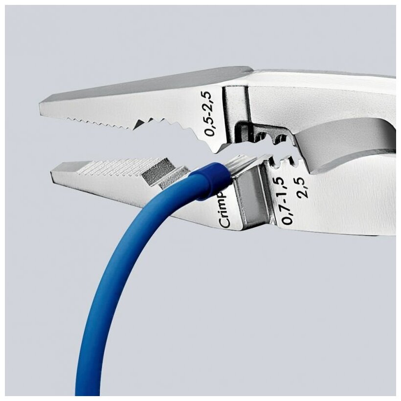 Многофункциональные клещи для электромонтажных работ- для захвата плоского и круглого материала, гибки, удаления заусенцев, резки кабеля, удаления изоляции и опрессовки контактных гильз. Отверстия для удаления изоляции с проводов 0,75-1,5 кв.мм. и 2,5 кв.мм., гнездо для конт.гильз 0,5 - 2,5 кв.мм.