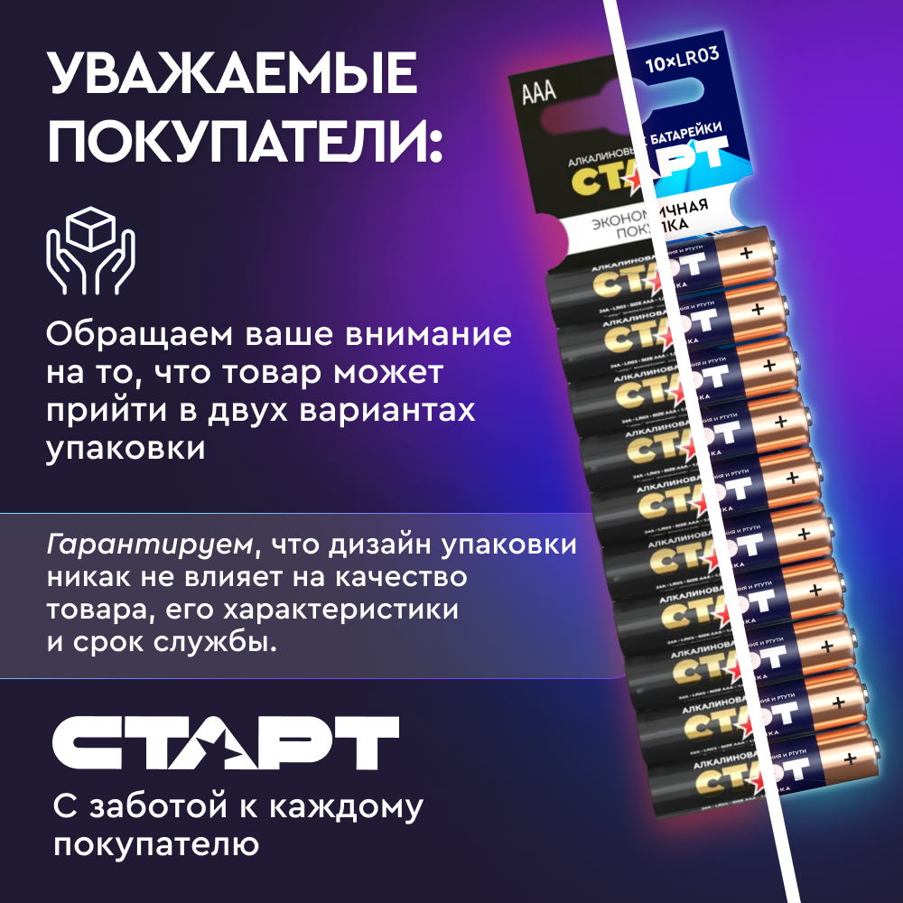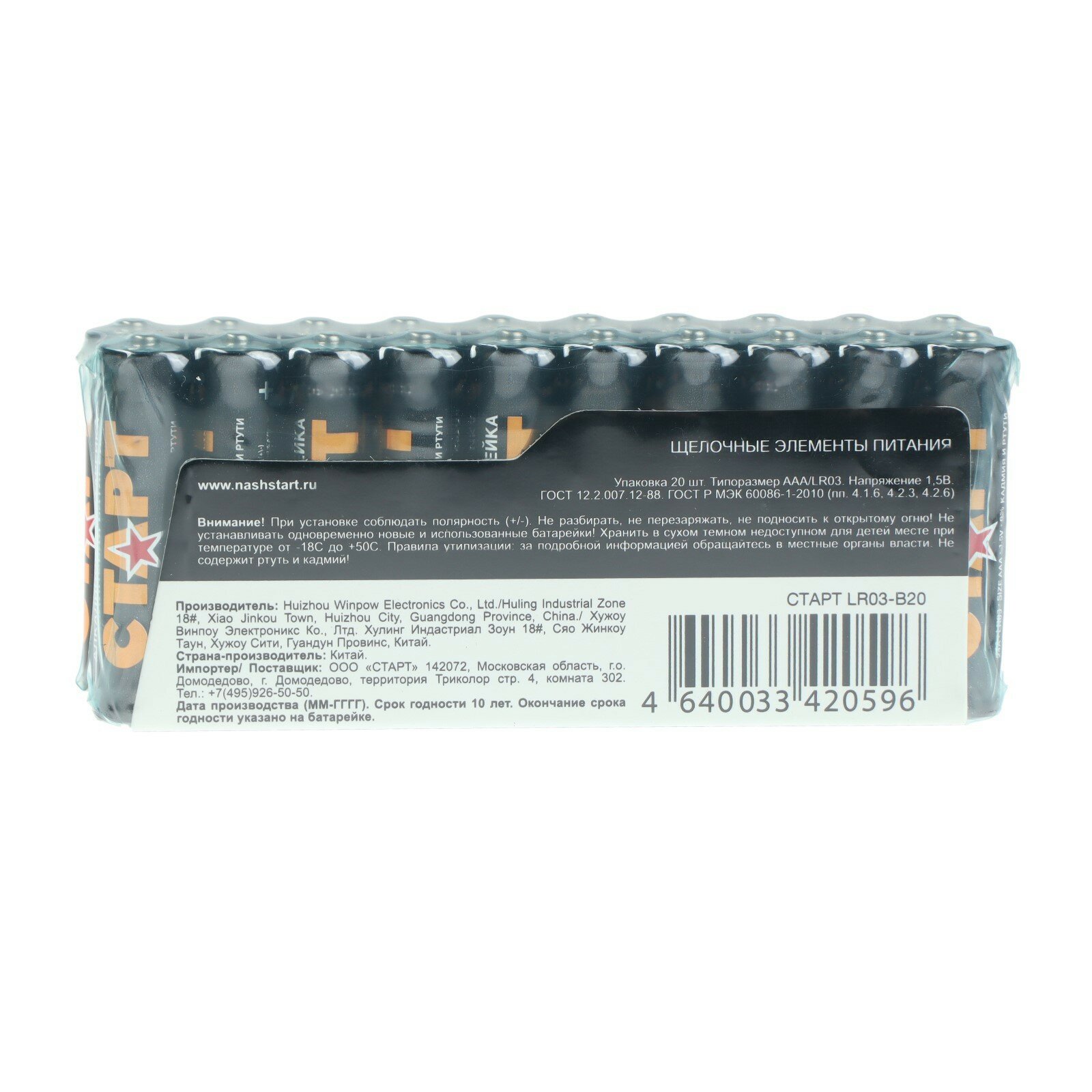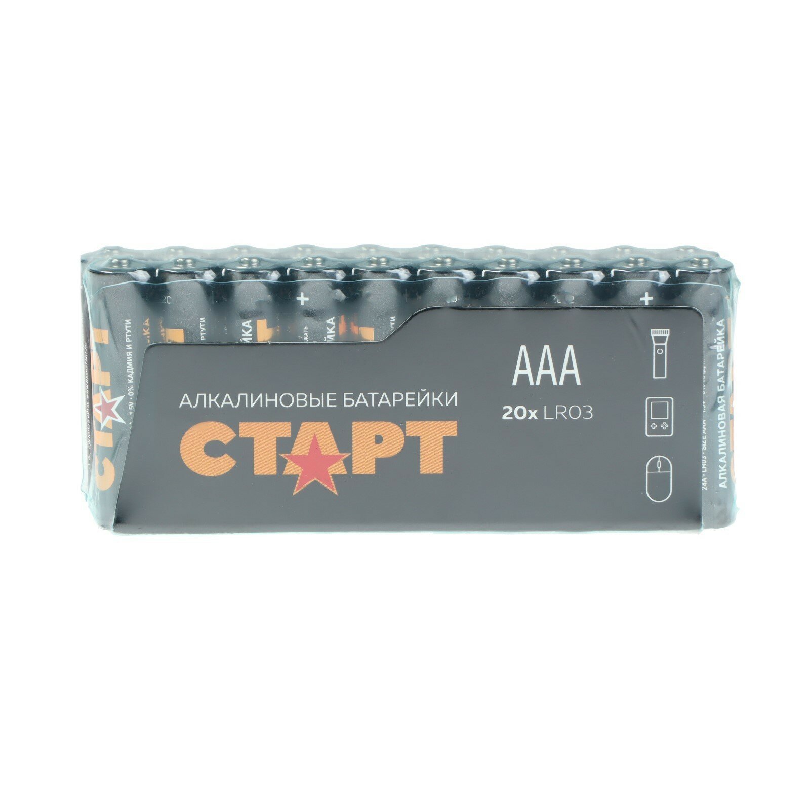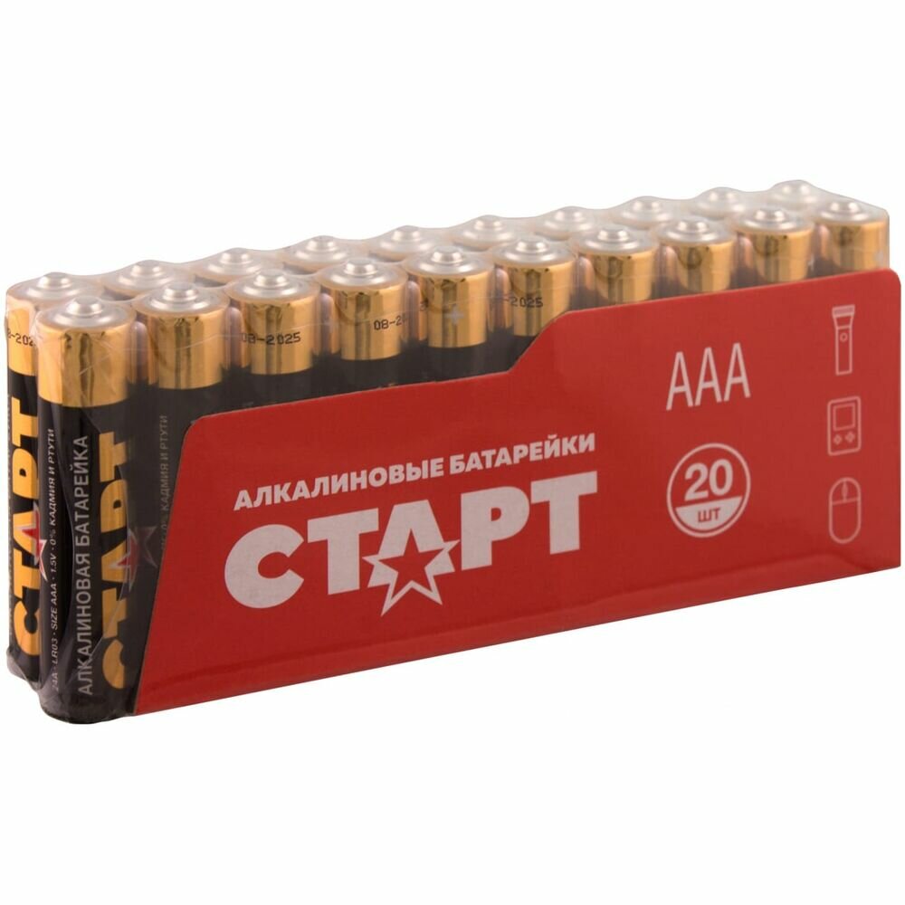 Суперэкономичный набор алкалиновых элементов питания от известного российского производителя старт состоит из 20-ти «мизинчиковых» батареек.Батарейки энергоёмки, не «текут» и не теряют стабильность заряда на всём протяжении работы вплоть до полного его истечения. Таким образом, Вы можете не беспокоиться, что устройство перестанет функционировать неожиданно. Особенно это актуально для осветительных приборов, а также медтехники.Кроме того, батарейки из комплекта старт LR03-B20 обладают отличными антивибрационными и противоударными свойствами.Сфера использования алкалиновых батареек популярного «мизинчикового» типа очень широка: аудио- и видеотехника, бытовые приборы, компьютерные клавиатуры и мыши, пульты управления и сигнализации, детские игрушки и пр.Приобретение набора из 20-ти батареек сбережёт Ваш семейный бюджет. Такая покупка обойдётся значительно дешевле, чем, если бы Вы брали элементы по одному.