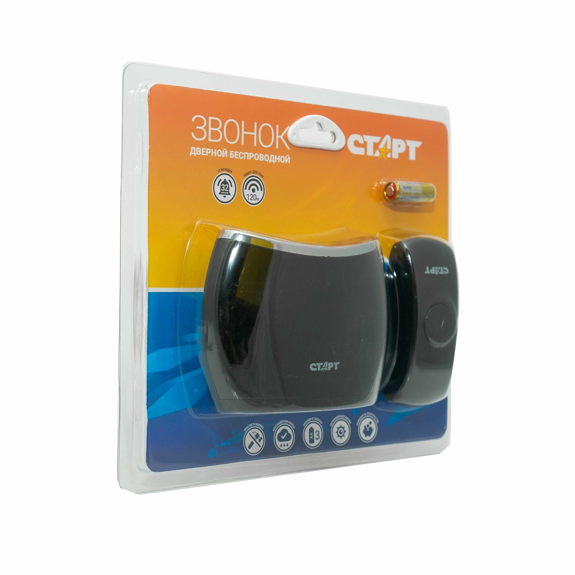 Беспроводной дверной звонок СТАРТ 1зв 1кн подходит там, где нет возможности проводить монтаж проводов, сверлить стены и применять строительные инструменты. Прибор легко и быстро крепится на специальный скотч и позволяет уже сразу пользоваться звонком. Стильный дизайн придется по вкусу любителям современных тенденций в интерьере. Легкий монтаж элементов звонка возможен благодаря использованию двухстороннего скотча, поставляемого в комплекте. Удержание приборов будет надежным и долговечным после подготовки и обезжиривания поверхности.Кнопка звонка имеет класс водонепроницаемости, что обеспечивает ей стабильную и бесперебойную работу на улице при различных климатических условиях В данной модели предусмотрена регулировка громкости звонка. На выбор предлагается 3 режима уровня звучания. Предустановленные мелодии вызова в количестве 32-х штук порадуют своим разнообразием. Максимальное расстояние приема сигнала по открытому воздуху составляет 100-120 метров.Звонок подойдет для использования на садовом участке или в частном доме с большой приусадебной территорией. Применение беспроводной технологии вызова экономит на дорогостоящей проводке.Питание электроприбора осуществляется от элементов питания — приемный блок питается от батареек АА, кнопка вызова от дискового элемента А23. Благодаря малому энергопотреблению обеспечивается длительная работа на одном комплекте батареек.