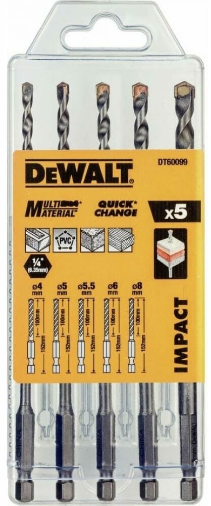 Набор DEWALT DT 60099 из пяти универсальных сверл для сетевых и аккумуляторных дрелей. Применяются для выполнения глухих и сквозных отверстий в древесине, пластмассе, мягкой стали, цветных металлах и кирпичной кладке.Особенности и преимущества:- Хромо-никель-молибденовая сталь обеспечивает наилучшую передачу энергии и стойкость к изломам даже в самых тяжелых условиях.- Наконечник имеет заточку 120°, которая гарантирует максимальную остроту, более быстрое сверление и увеличенный срок службы.- Хвостовик с тремя фрезерованными плоскостями предотвращает проворачивание сверла в патроне.Комплектация: сверла - 5 шт; упаковка.