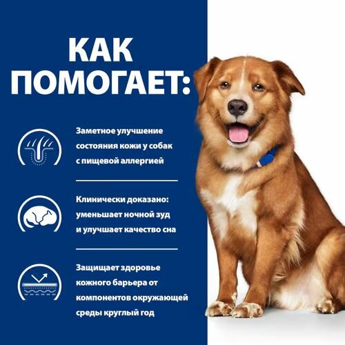 Сухой диетический корм Hill's PRESCRIPTION DIET Derm Complete - единственный рацион Hill’s для собак, помогающий справляться как с чувствительностью к компонентам пищи, так и к компонентам окружающей среды. Ключевые преимущества: Создан для защиты кожного барьера от воздействия компонентов окружающей среды в течение всего года Видимое восстановление кожи у собак с пищевой аллергией всего за 21 день* Клинически доказано: помогает уменьшить проявления аллергических реакций, включая разлизывание, зуд, потряхивание головой и покраснение кожи, всего за 28 дней* Содержит высокий уровень незаменимых жирных кислот для поддержания здоровья кожи Derm Complete содержит все необходимые вашему питомцу питательные вещества и подходит для длительного применения. Проконсультируйтесь с ветеринарным специалистом для получения дополнительной информации о том, как диетические рационы Hill's Prescription Diet могут помочь вашей собаке поддержать счастливую и активную жизнь. Не рекомендуется: Щенкам Беременным и кормящим собакам Собакам с гиперлипидемией, с панкреатитом, риском развития панкреатита или панкреатитом в анамнезе